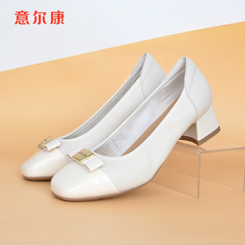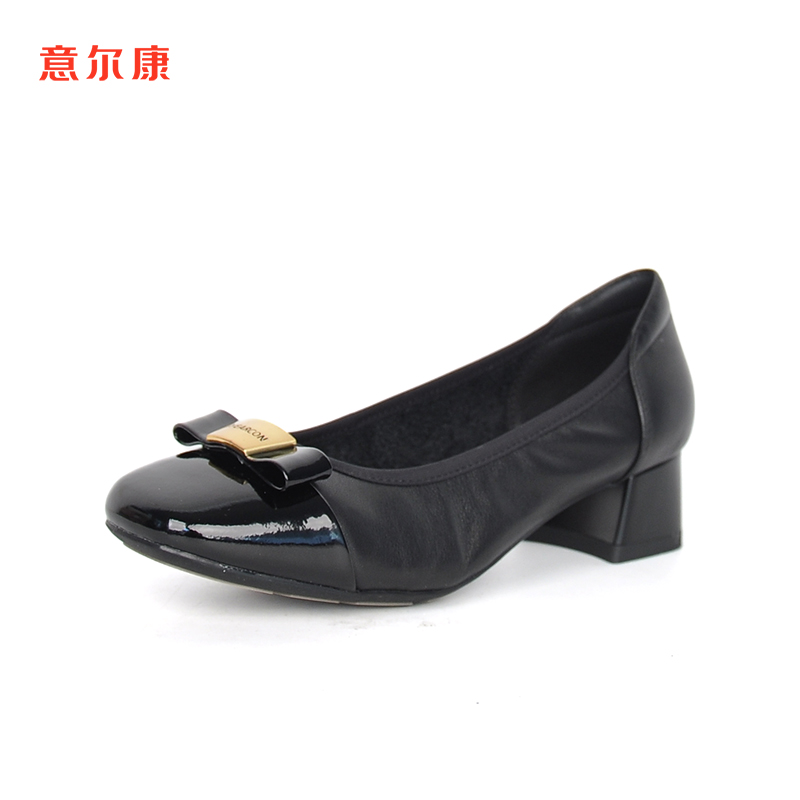 漆皮方头粗跟蝴蝶结浅口一脚蹬百搭女单鞋 新款 2025春季 意尔康女鞋