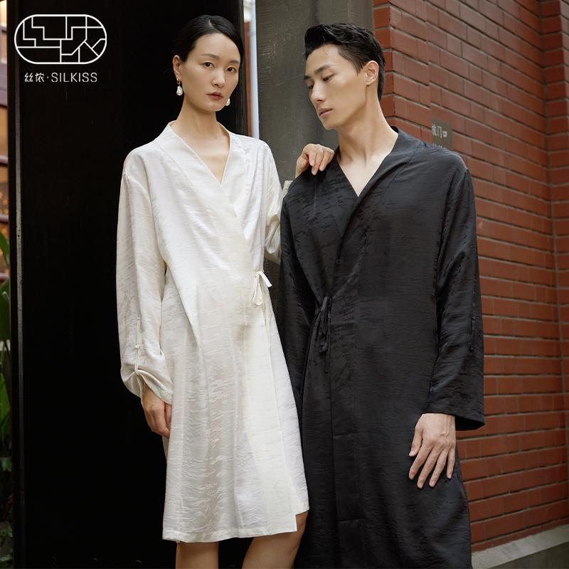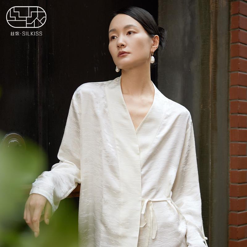 高级感白色提花桑蚕丝长款 真丝睡袍女长袖 袍子 丝侬中式 双11预售