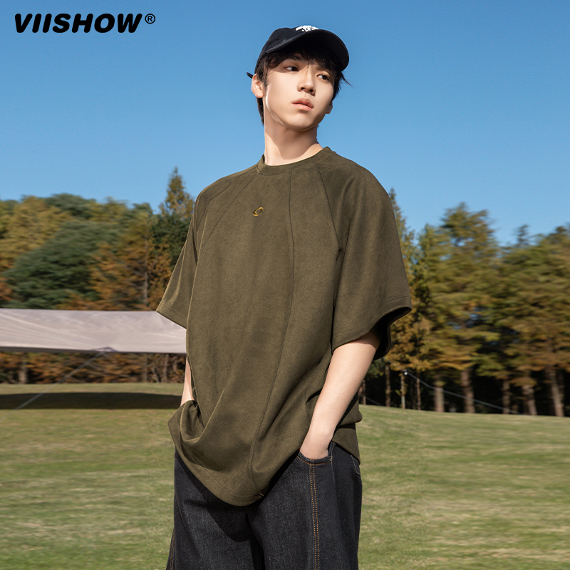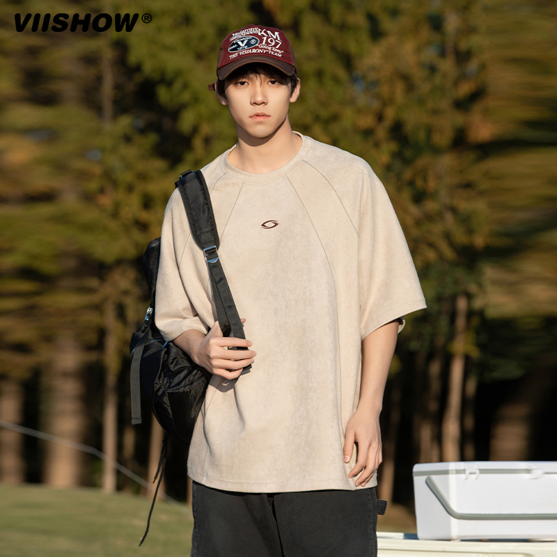 短袖 新款 潮牌宽松上衣 复古重磅麂皮绒T恤男2025年夏季 VIISHOW美式