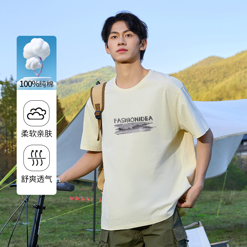 青少年印花正肩半袖 班尼路美式 夏季 男款 白色纯棉百搭t恤A 潮流短袖