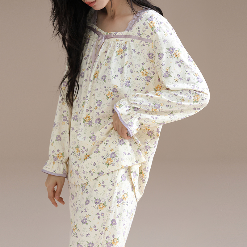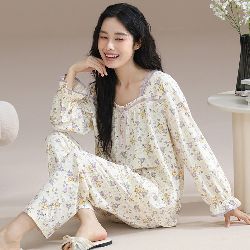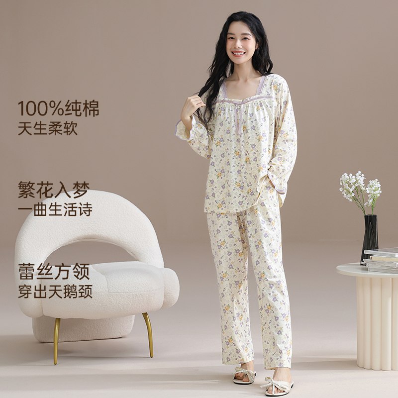 纯棉女士长袖 睡衣新款 秋款 家居服秋冬全棉大码 芬腾春秋季 套装 女款