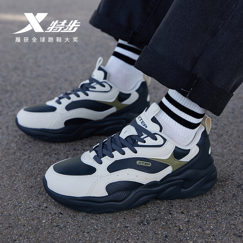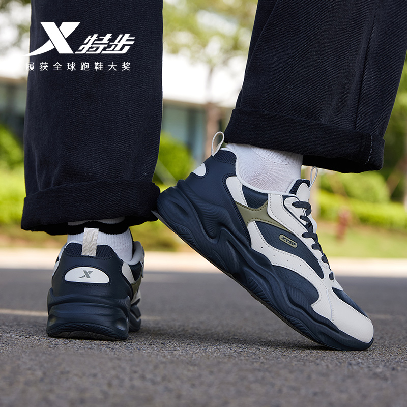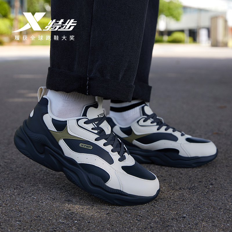 2025新款 皮面运动鞋 软底防水跑步休闲鞋 黑色秋季 子男正品 特步男鞋