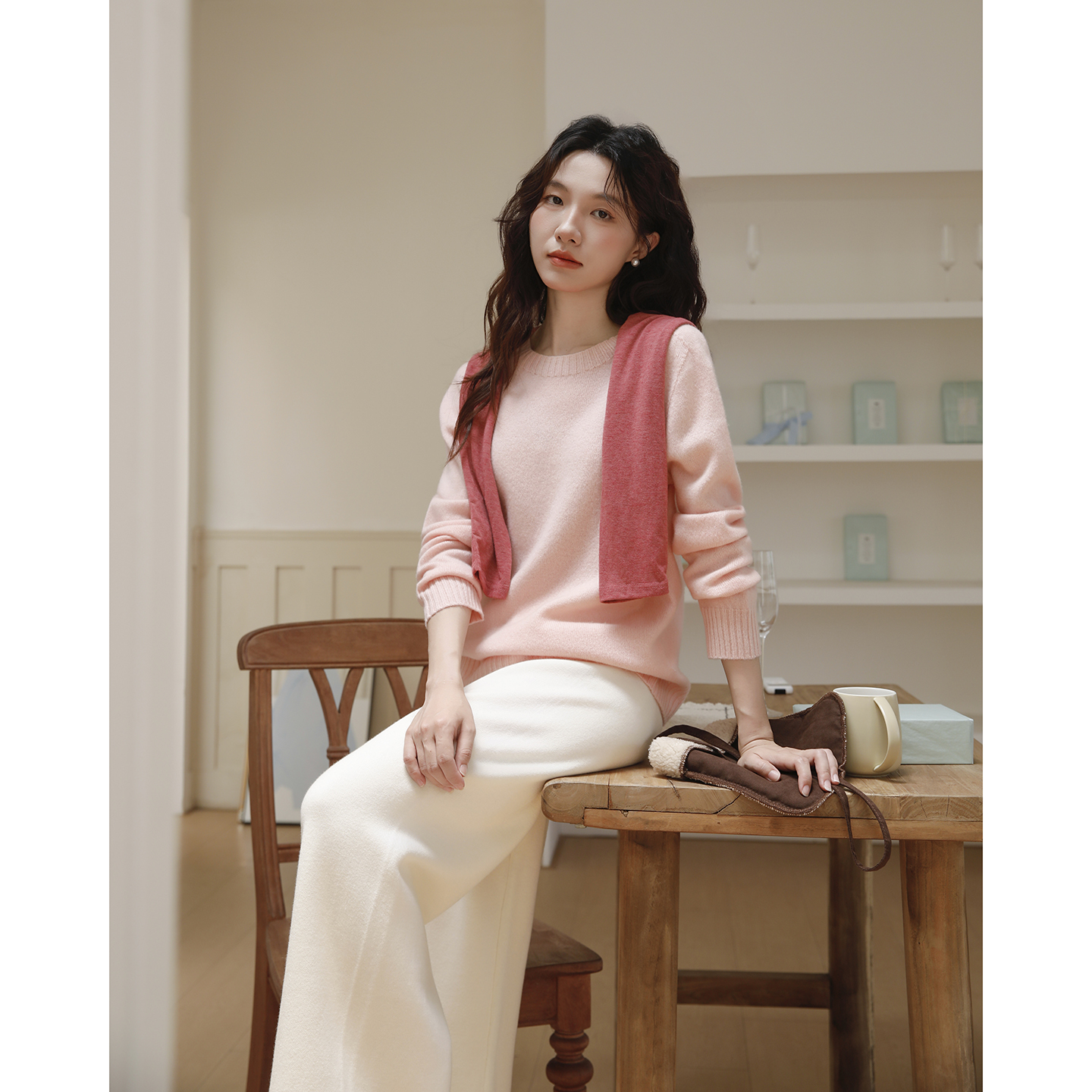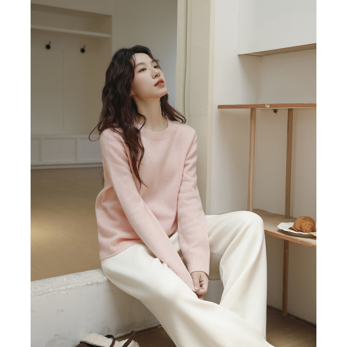 粉色圆领毛衣慵懒高级感宽松外穿套头针织上衣全羊毛打底衫 女秋冬
