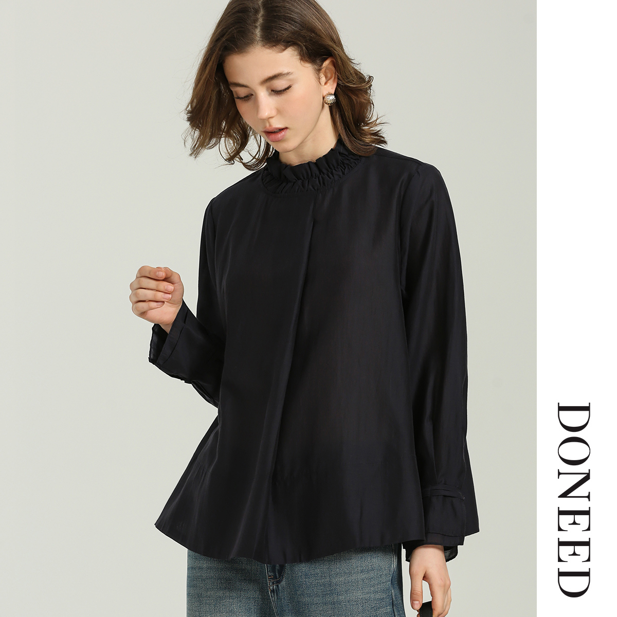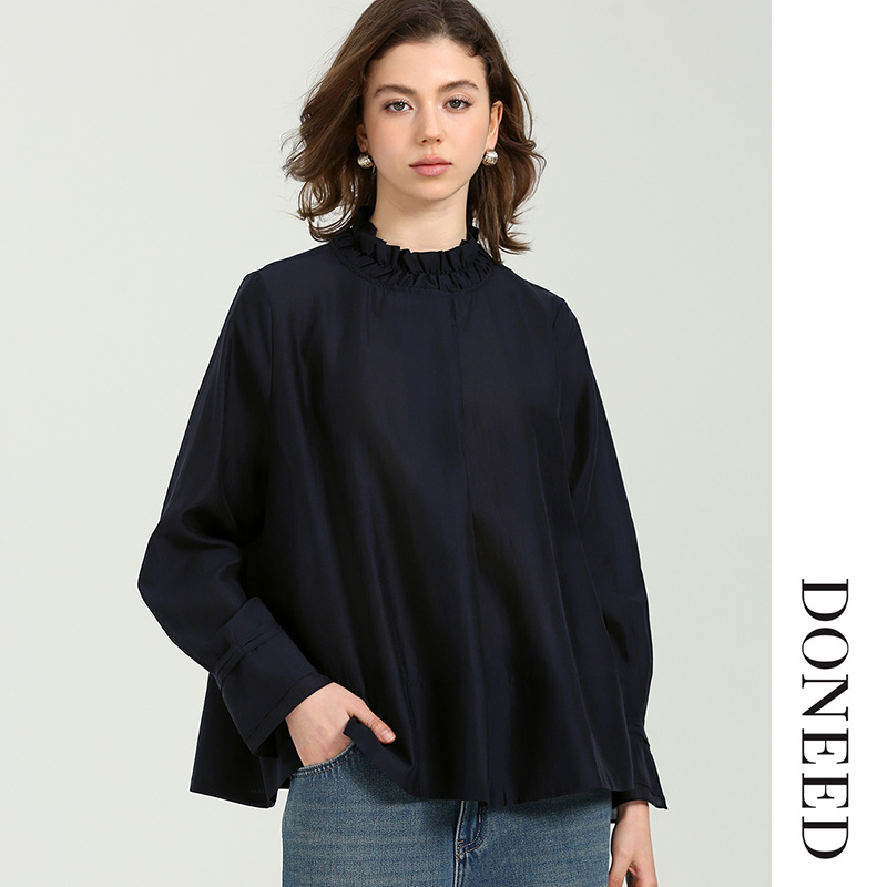 上衣女 褶皱荷叶边领纯色简约气质天丝衬衫 DONEED夏款 新中式