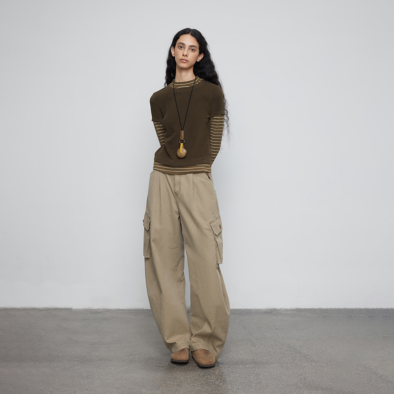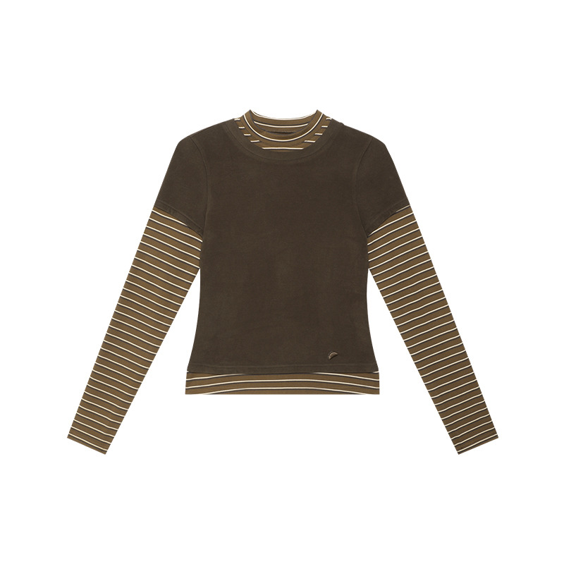 圆领长袖 半圆原创女装 假两件修身 2025秋季 t恤女条纹拼接 运动