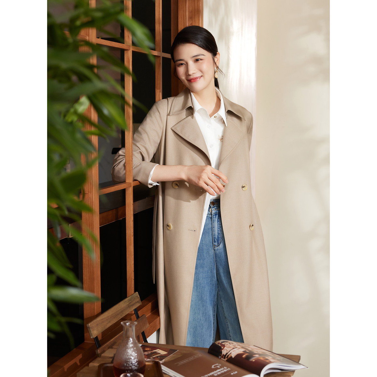 经典 高智中长款 翻驳领 新款 双排扣风衣外套女 粉蓝衣橱2025秋装