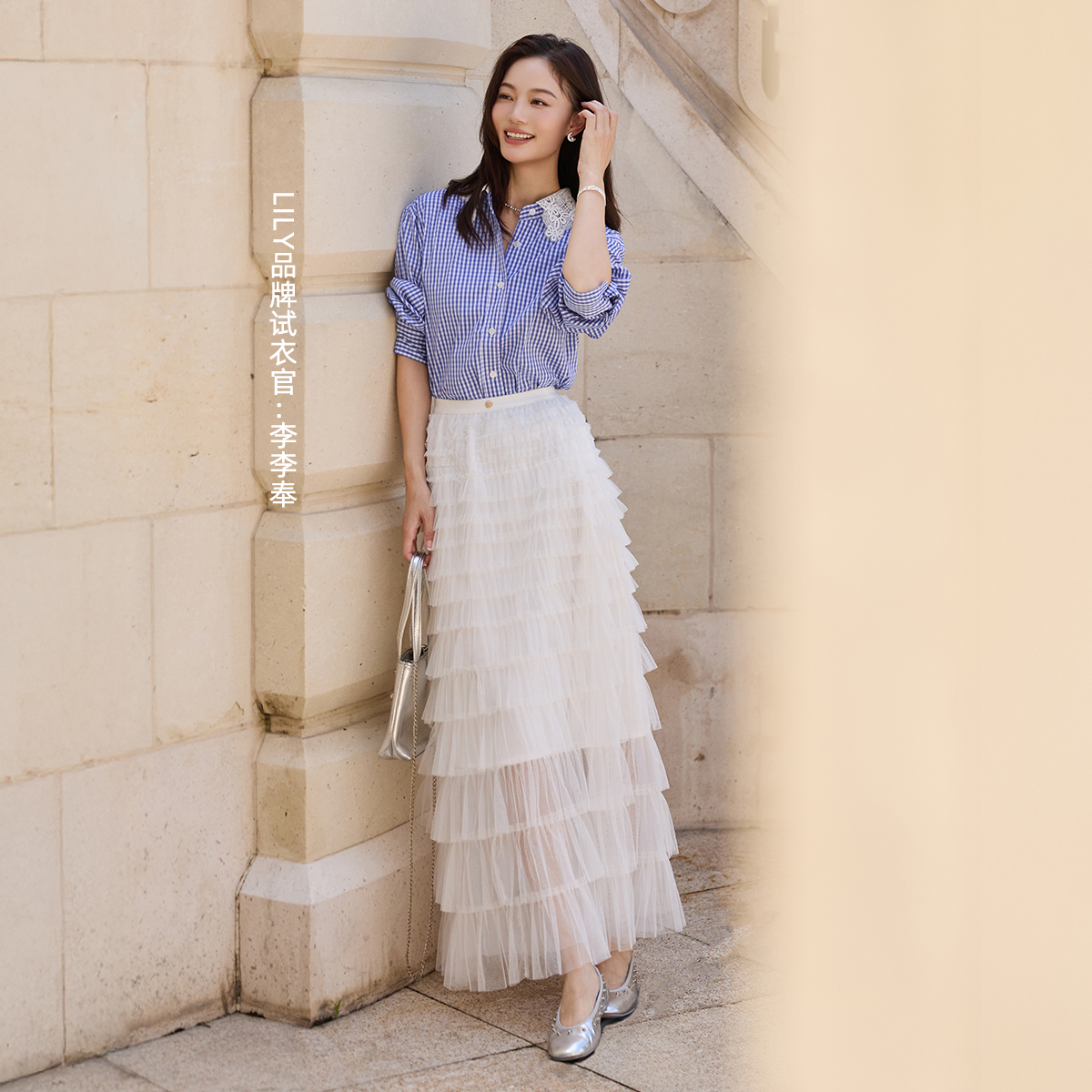 衬衫 设计感玫瑰领口高级简约格纹撞色长袖 女 RED芭莎红 BAZAAR