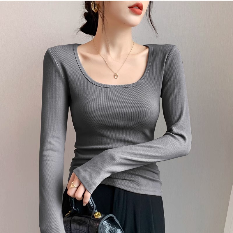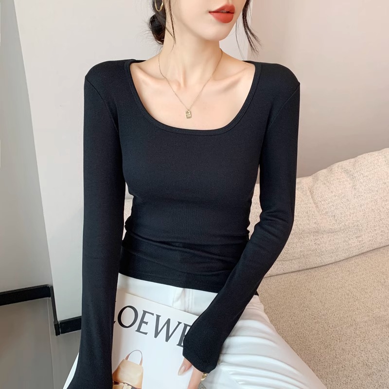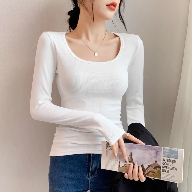 t恤修身 洋气U领长袖 内搭大领口方领白色上衣 女2025春秋新款 打底衫