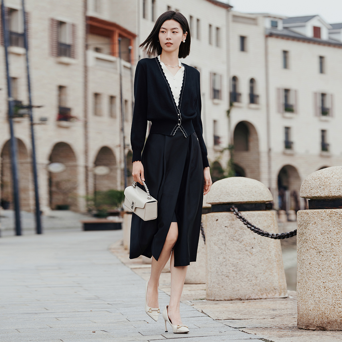 简约黑白撞色假两件开衫 歌蒂诗秋专柜款 1E33Z1567 绵羊毛开衫