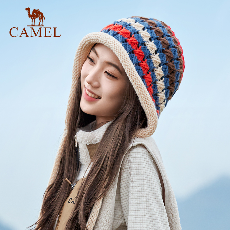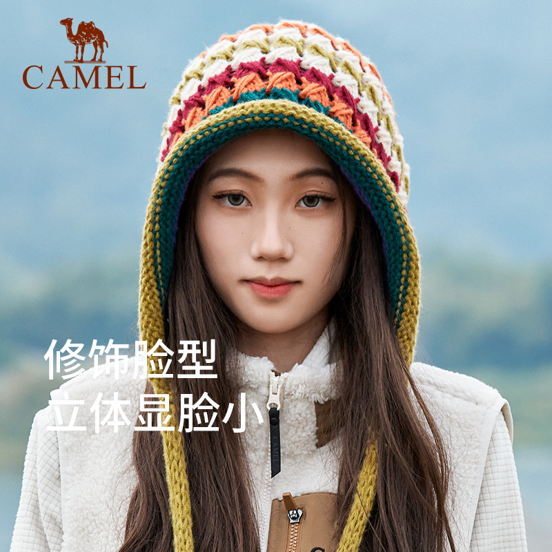 骆驼手工钩针彩色毛线帽子女秋冬流苏套头冷帽多巴胺彩虹色针织帽