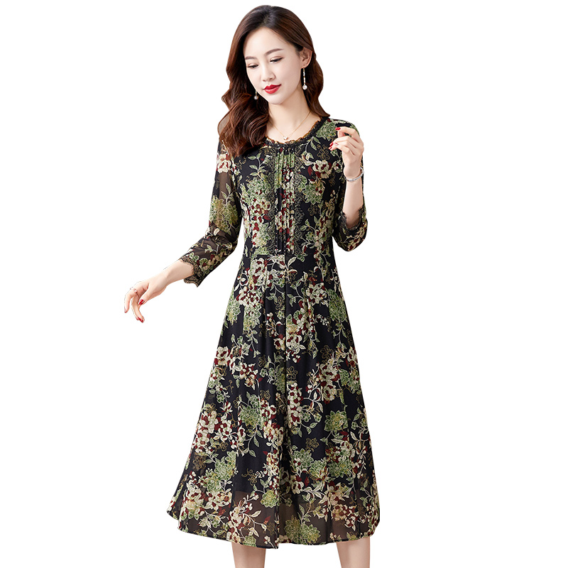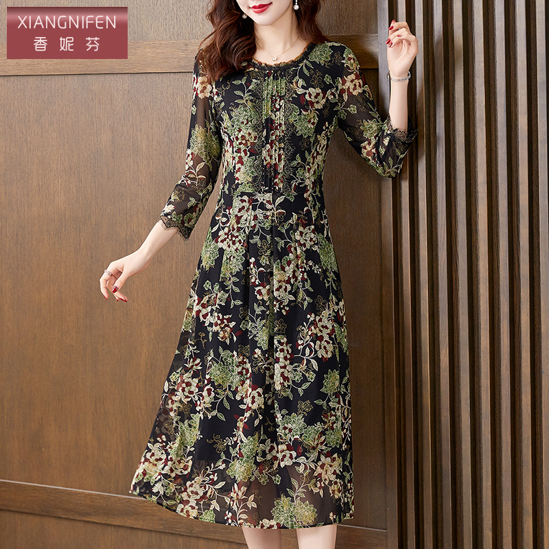 香妮芬高端品牌台湾纱中年妈妈连衣裙2025秋季 圆领气质中长裙 新款