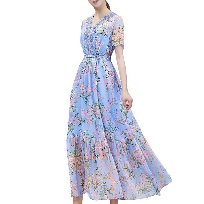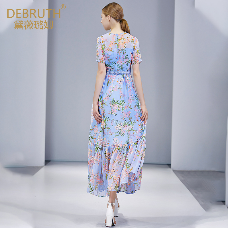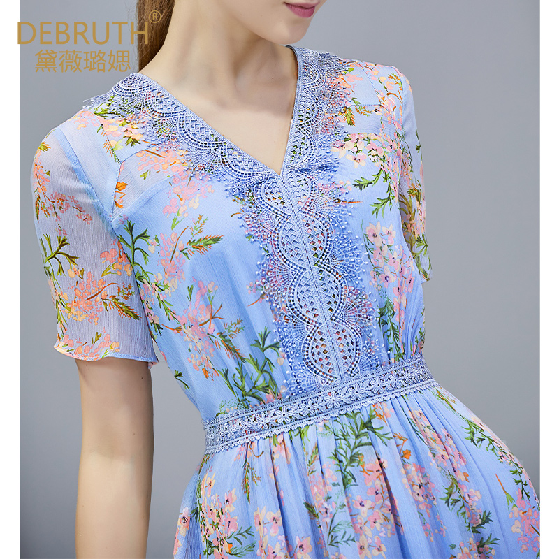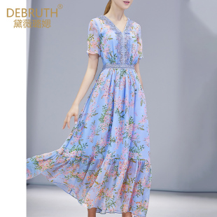 气质收腰A裙 新款 黛薇璐媤浅蓝花边碎花雪纺公主连衣裙女长款 夏季