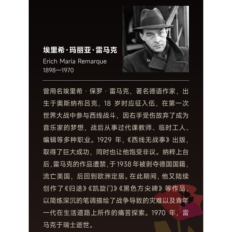 反战文学上海译文出版 社奥斯卡同名电影原著小说 另著凯旋门 西线无战事 应许之地 雷马克作品经典 黑色方尖碑 里斯本之夜 译文经典