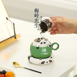 梅岭先生熊猫陶瓷情侣对杯马克杯咖啡杯带过滤茶杯姓氏杯定制礼物