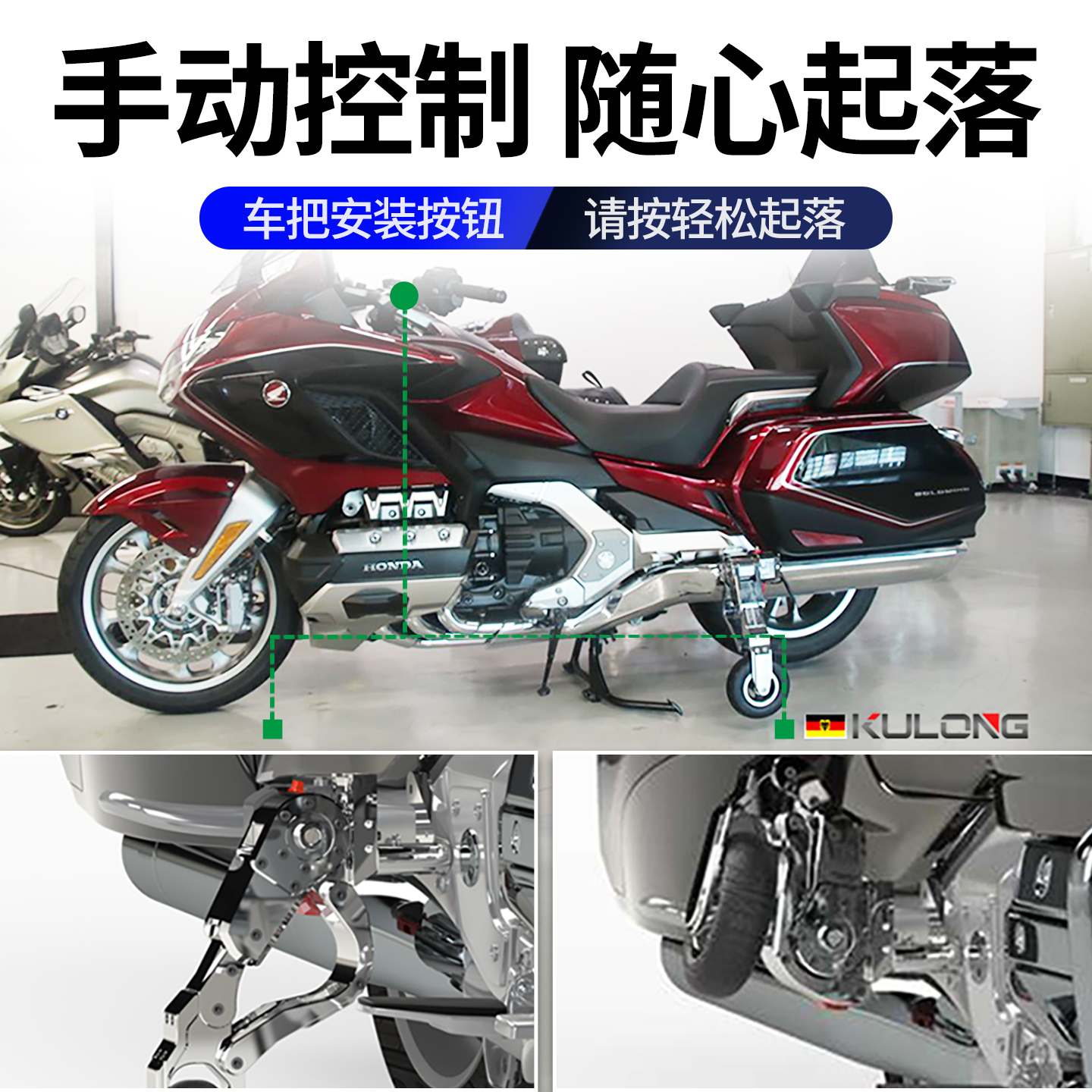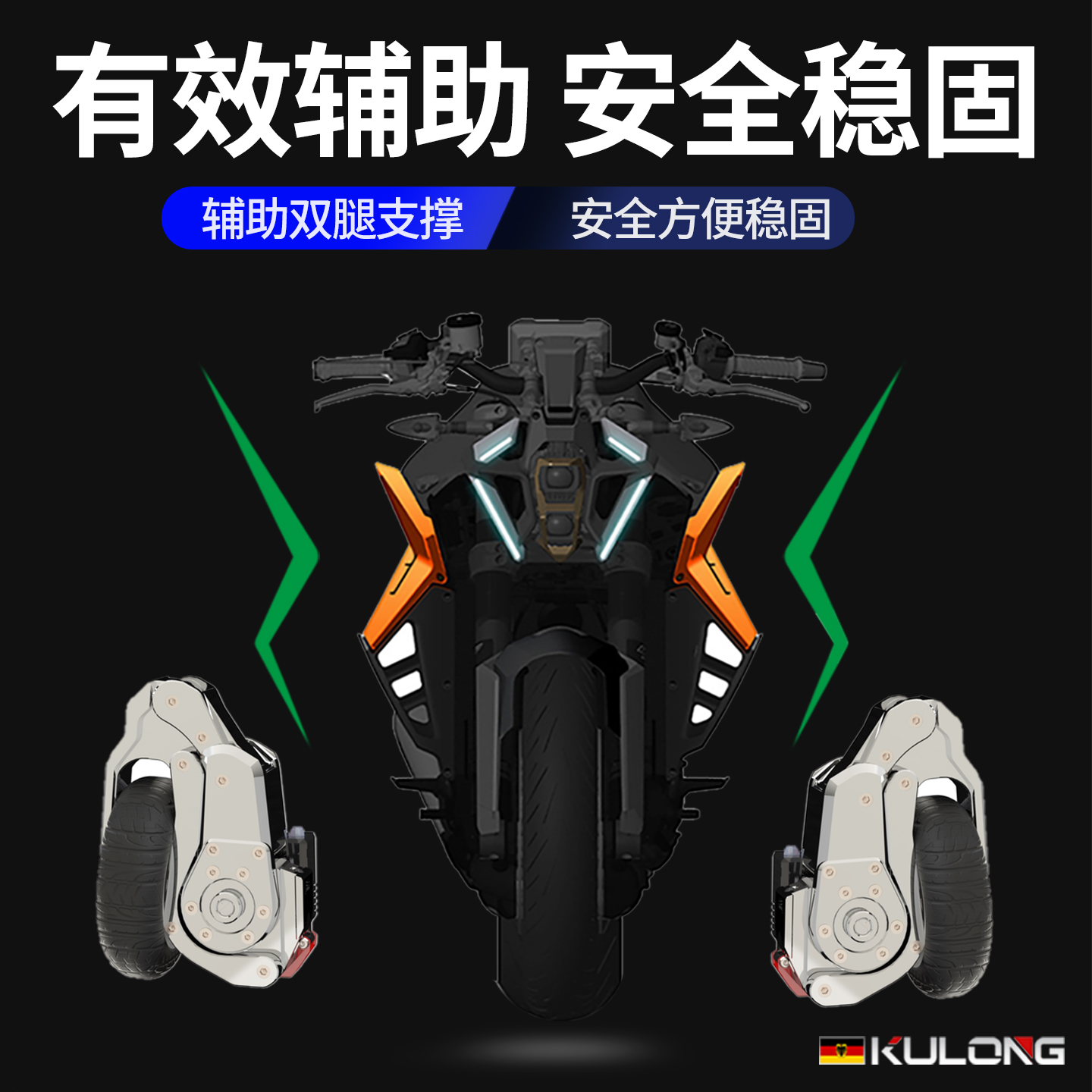库珑摩托车重机辅助轮智能防摔倒车停车定制自动收放可折叠启停架