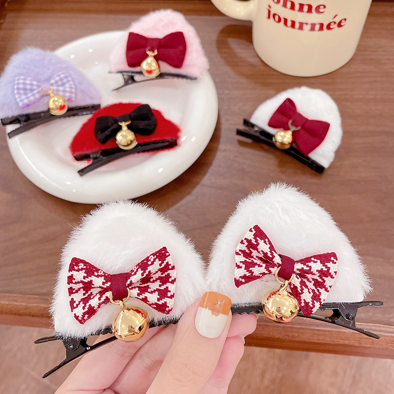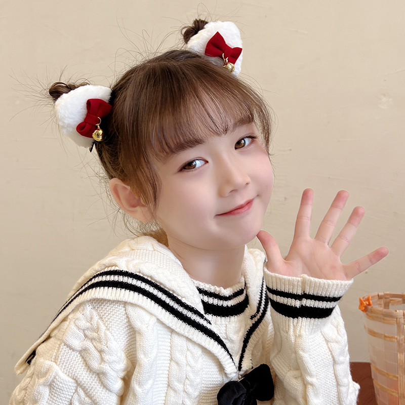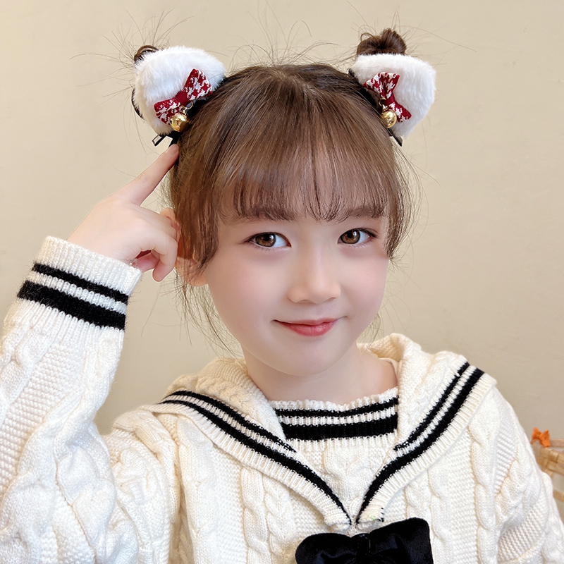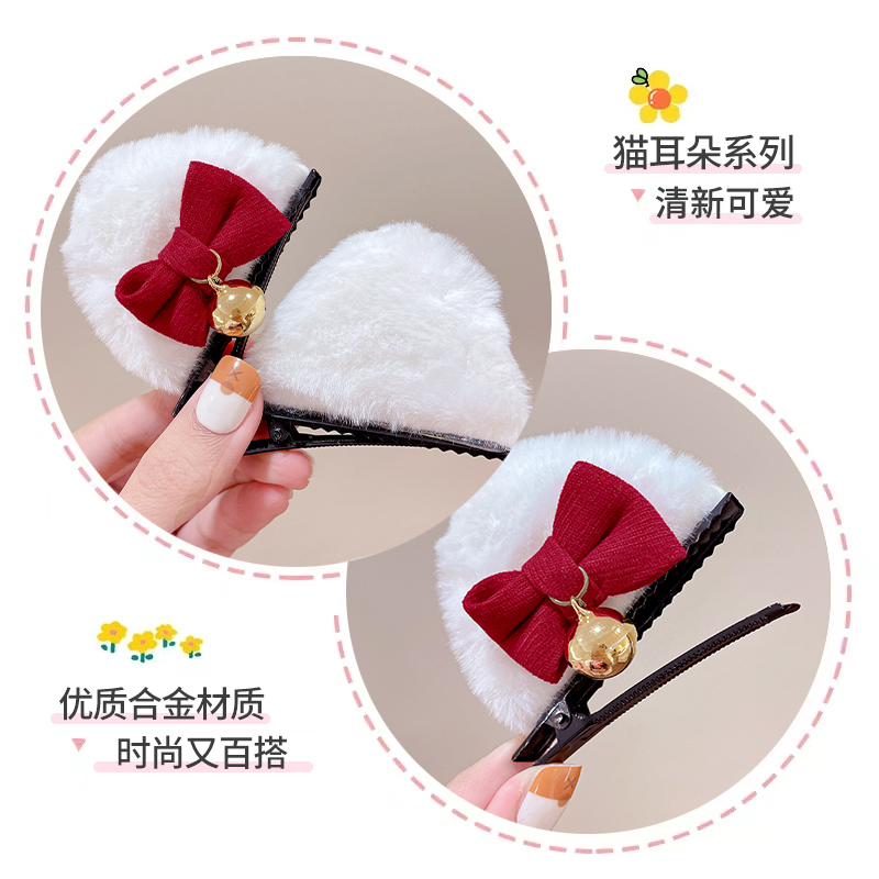 儿童可爱立体猫耳朵发夹女童秋冬毛毛蝴蝶结铃铛顶夹发卡毛绒头饰