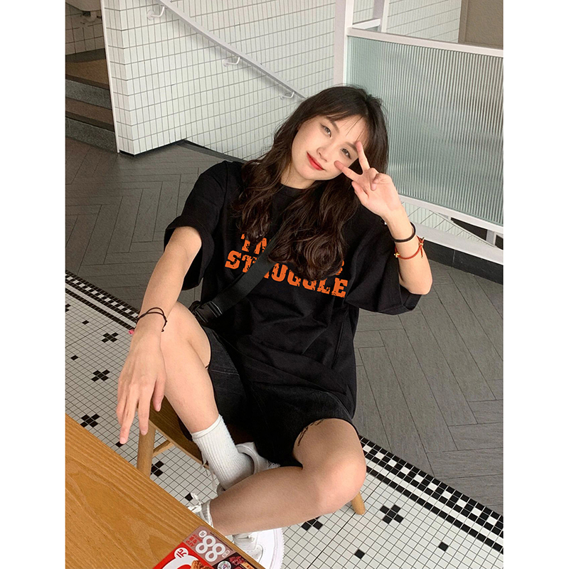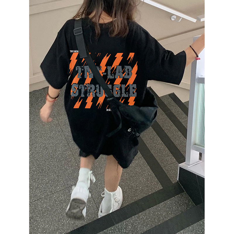 2023新款 美式 胖mm黑色上衣女装 t恤女夏纯棉宽松大码 复古潮牌短袖