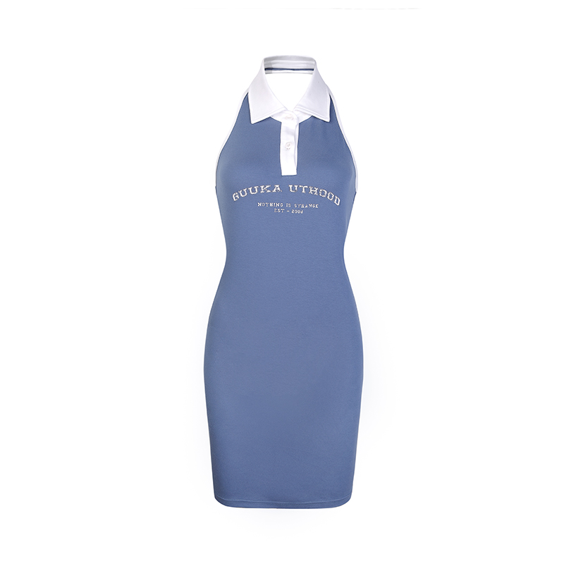GUUKA深蓝色挂脖吊带连衣裙女修身 领露背裙子女 性感辣妹风POLO衫