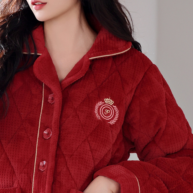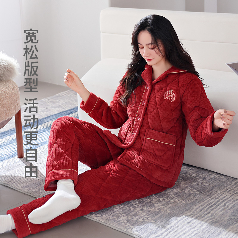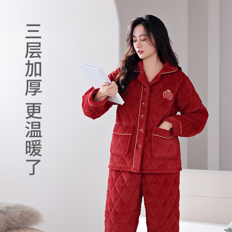 新一步法兰绒三层夹棉保暖睡衣女加厚小棉袄开衫 毛衣珊瑚绒家居服