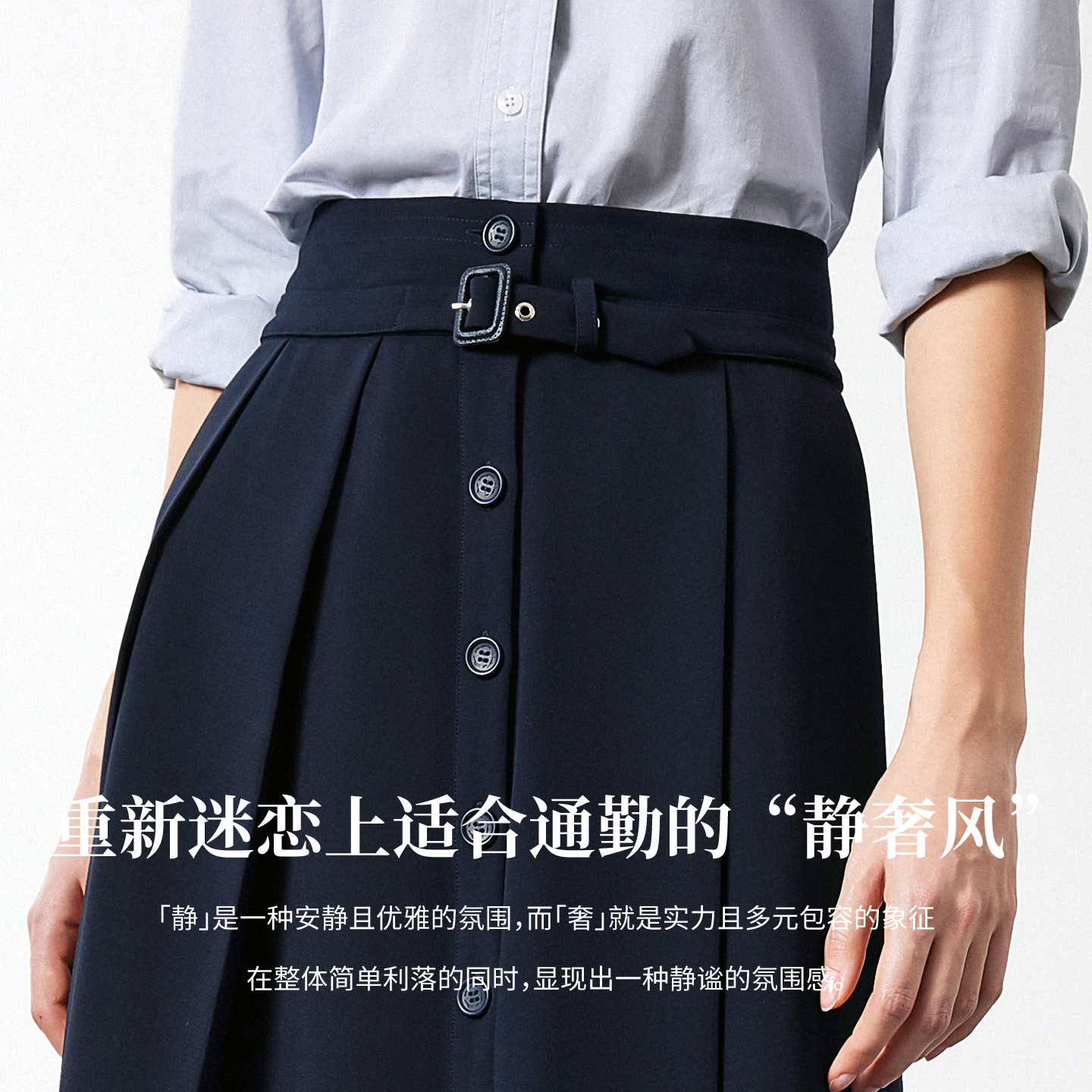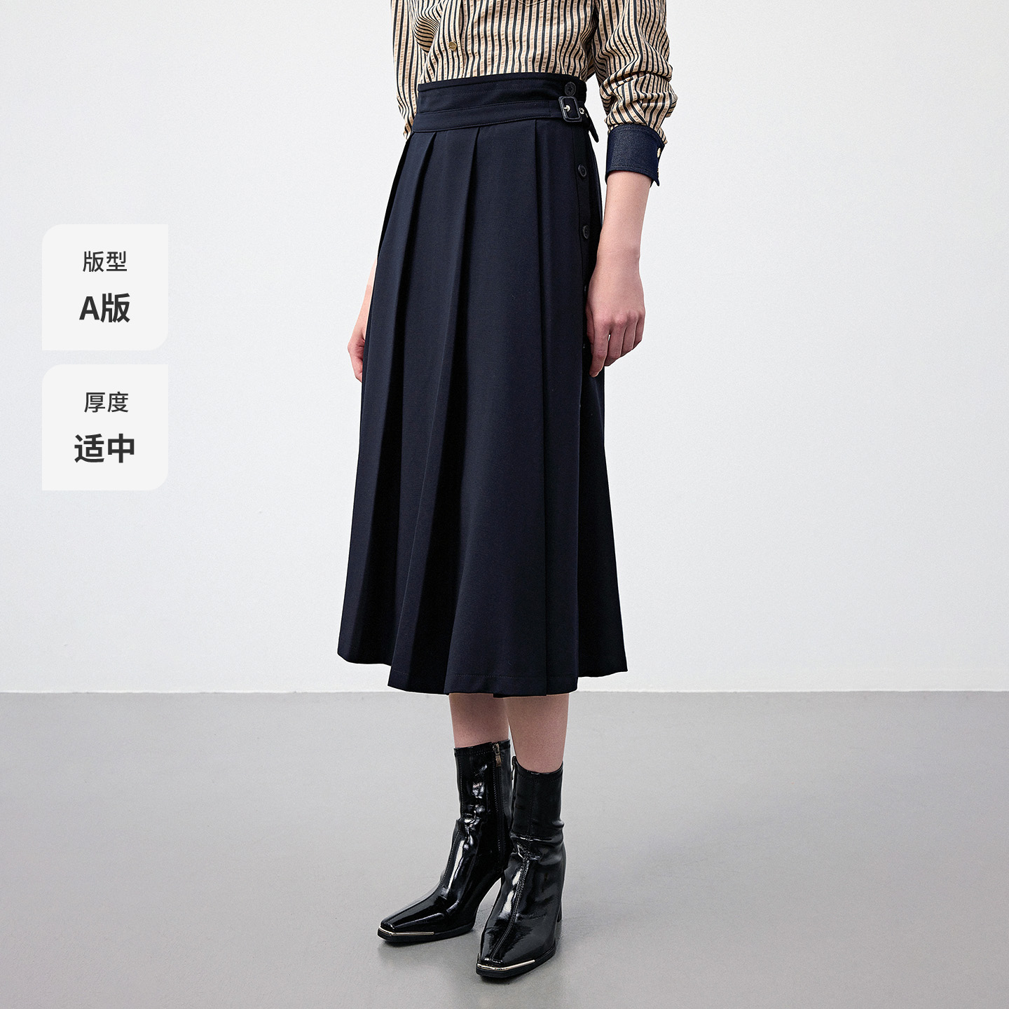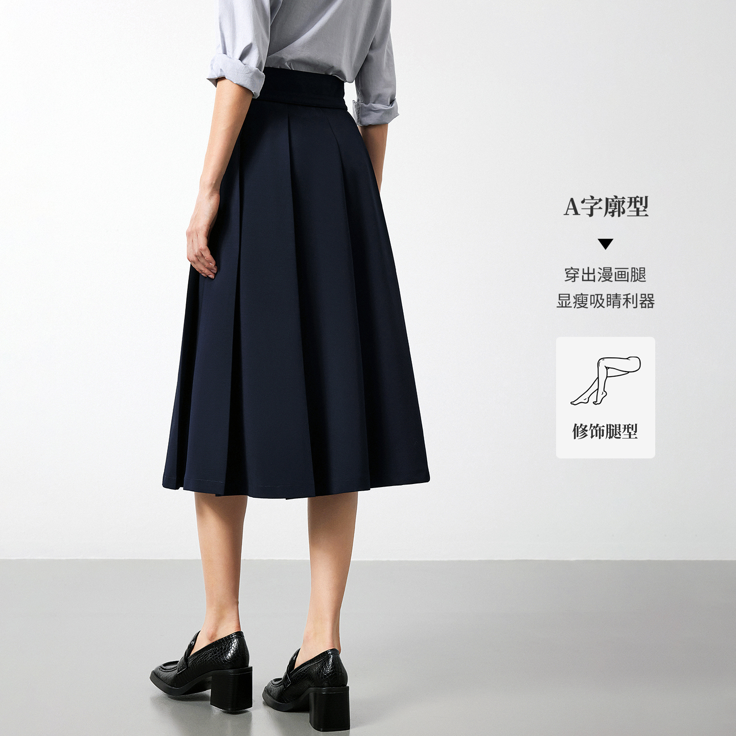 Navigare意大利小帆船通勤半身裙女秋季 伞裙高腰A字裙百褶裙 修身