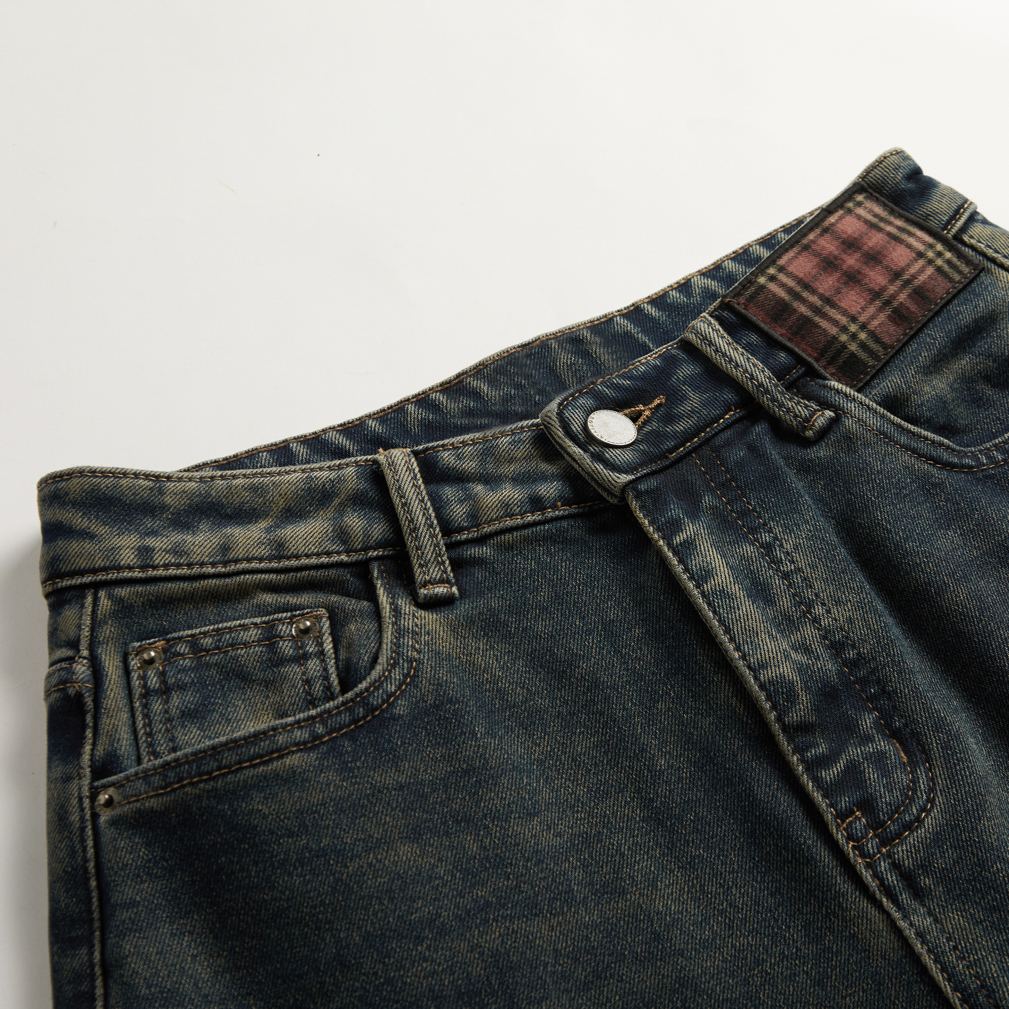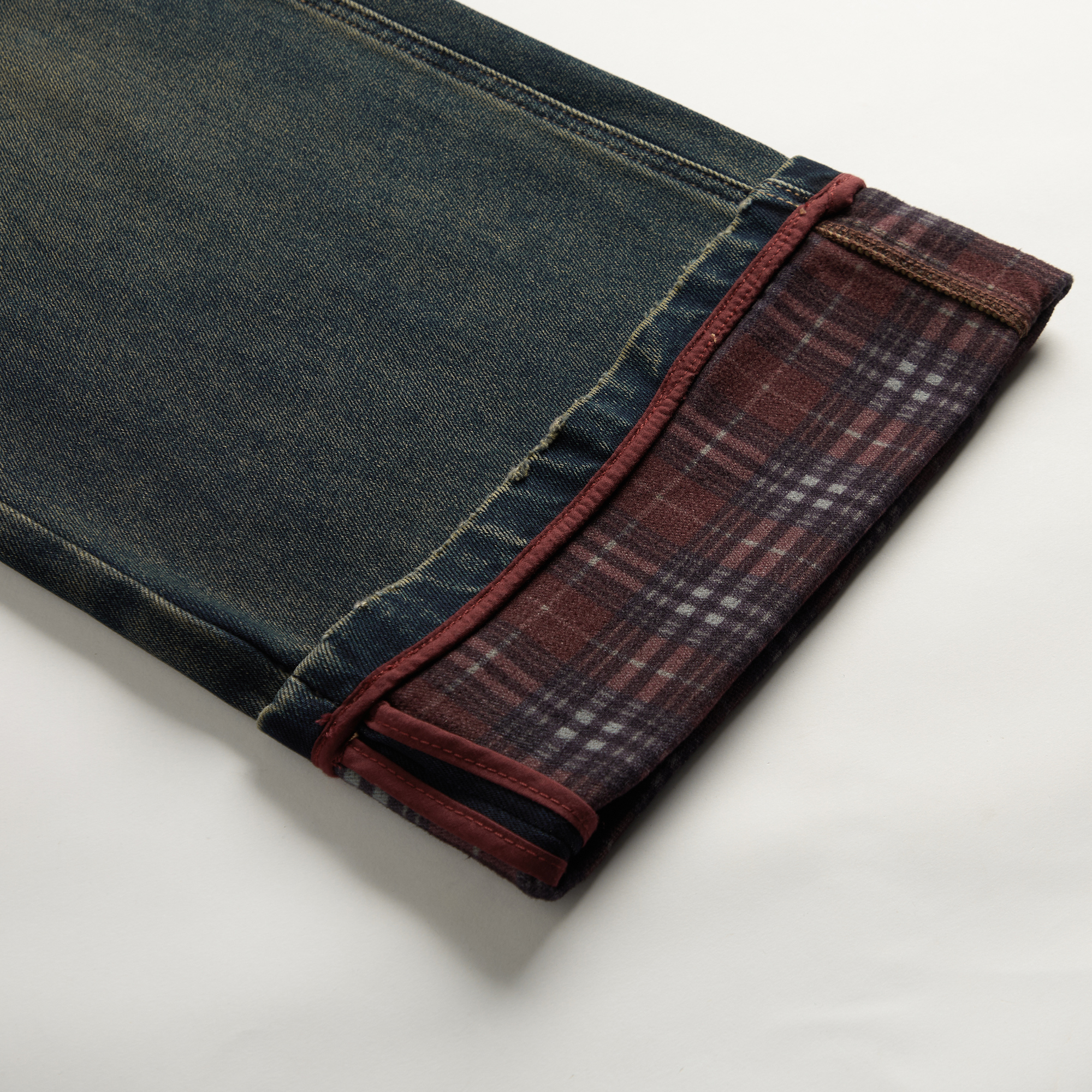 加绒阔腿直筒裤 Basic 女2024冬季 百家好复古格子卷边牛仔裤 House