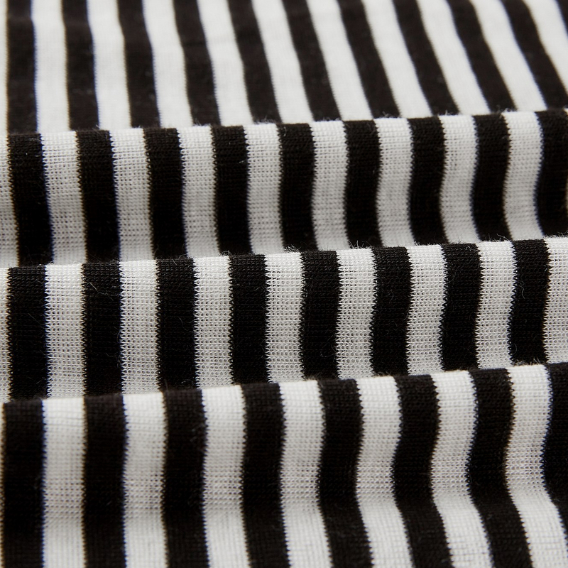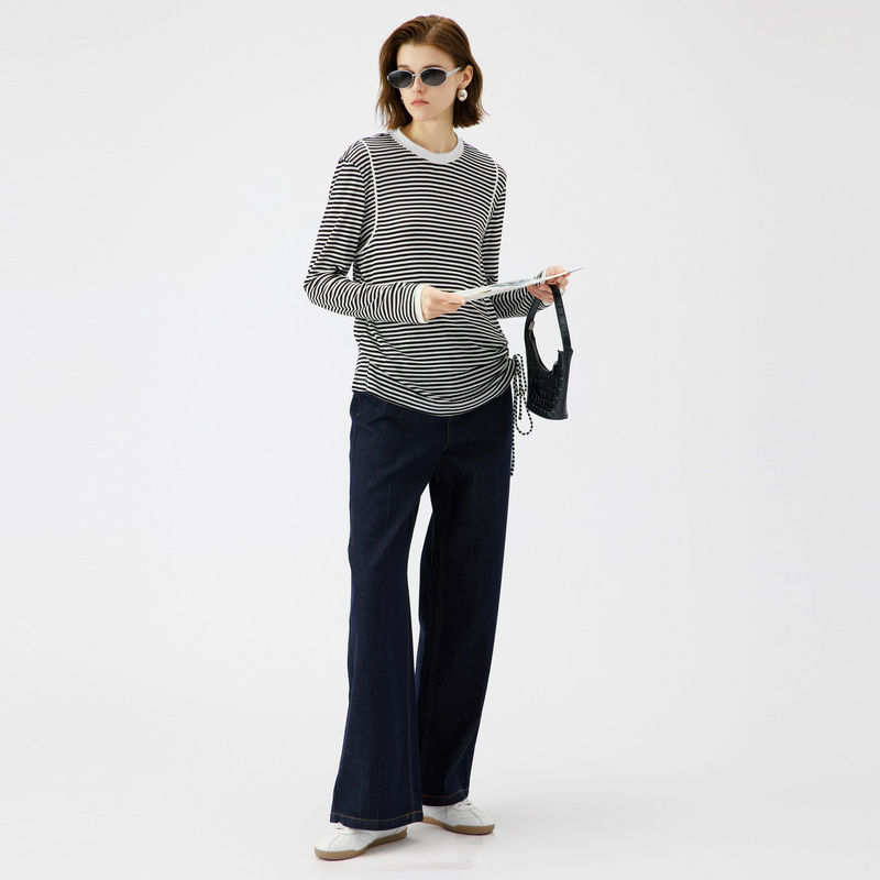 TI圆领黑白条纹长袖 新款 T恤女装 显瘦上衣尤缇2025秋季 抽绳修身