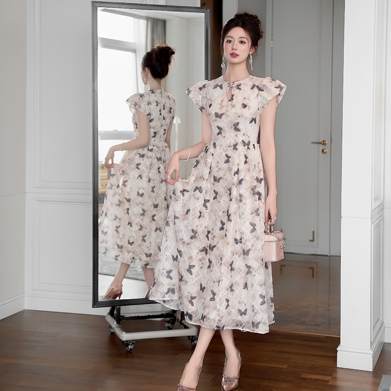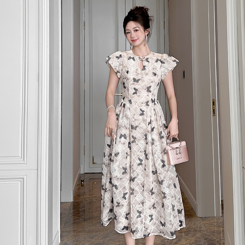 菲梦伊钉珠花朵连衣裙女夏装 轻薄设计感收腰显瘦百褶长裙 飘逸时尚