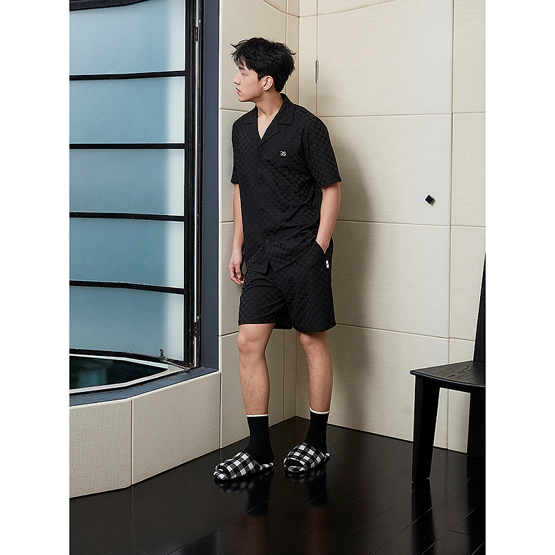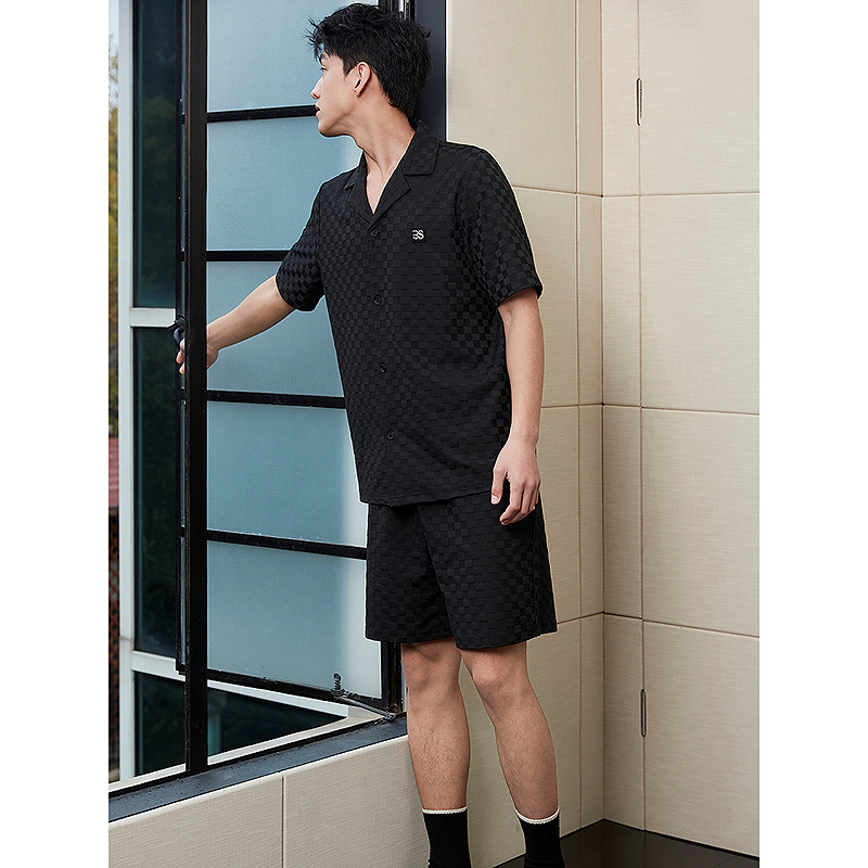 家居服 男时尚 黑色棋盘格格纹短袖 睡衣套装 休闲家居服 短裤 GXG男士
