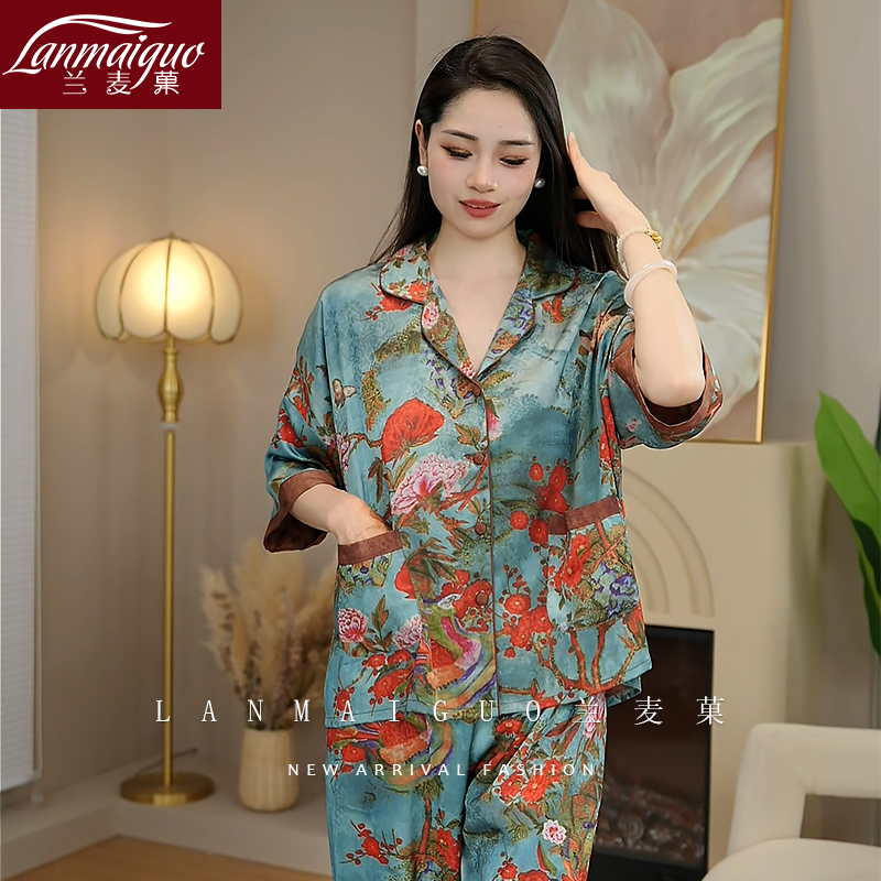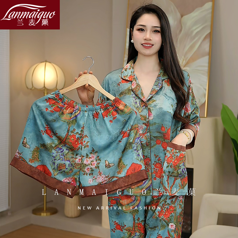 国风仿真丝绸家居服 冰丝睡衣女三件套新中式 兰麦菓2025新款 春夏季
