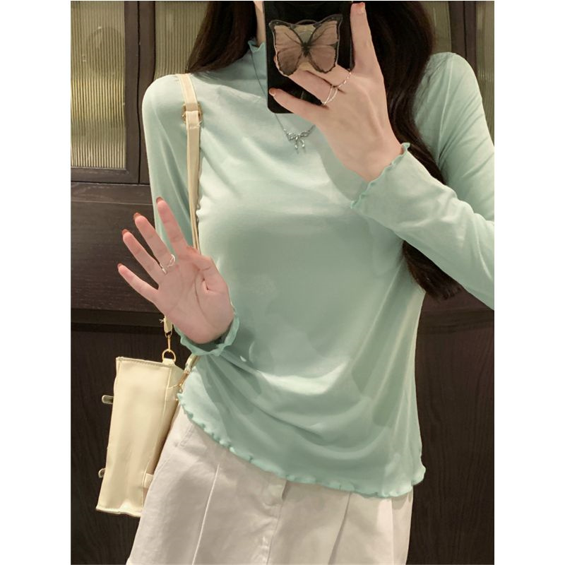 T恤木耳花边韩版 内搭长袖 上衣潮 女早春修身 简约纯色半高领打底衫