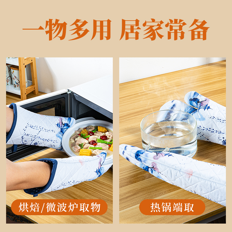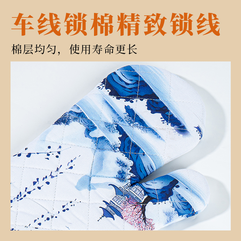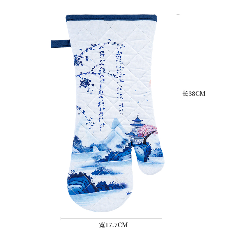 山水画烘焙防烫烤箱手套加长国风印花耐高温微波炉隔热手套厚纯棉