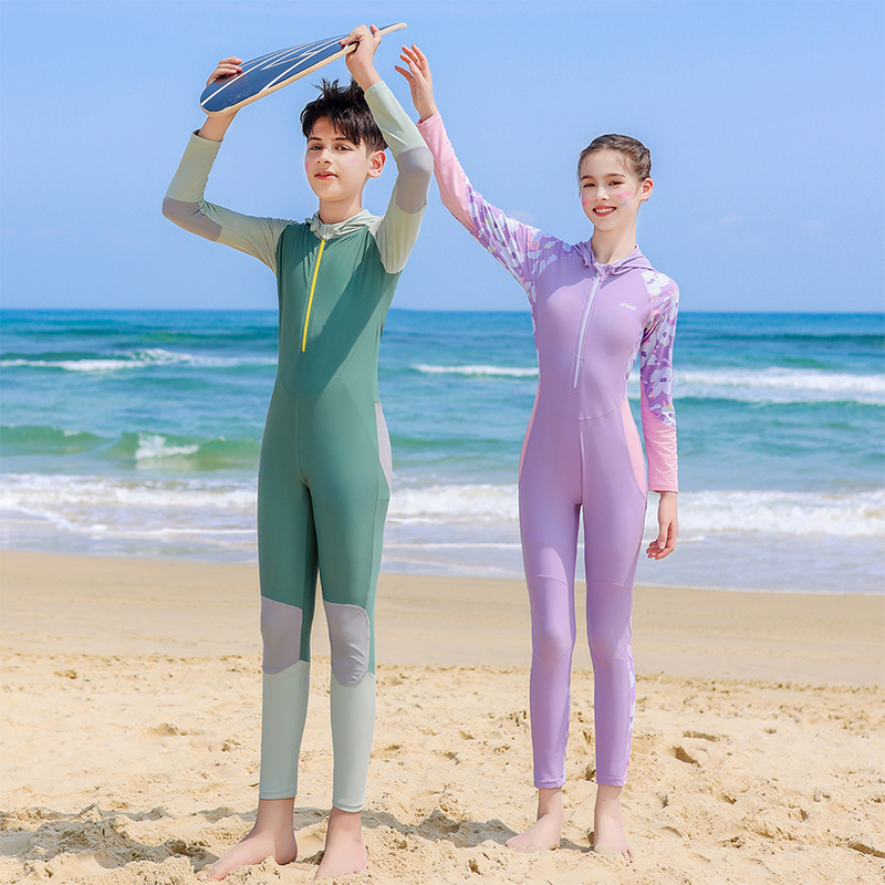 特步儿童泳衣2025新款 连体女童中大童可拆卸帽冲浪潜水服 保守长袖