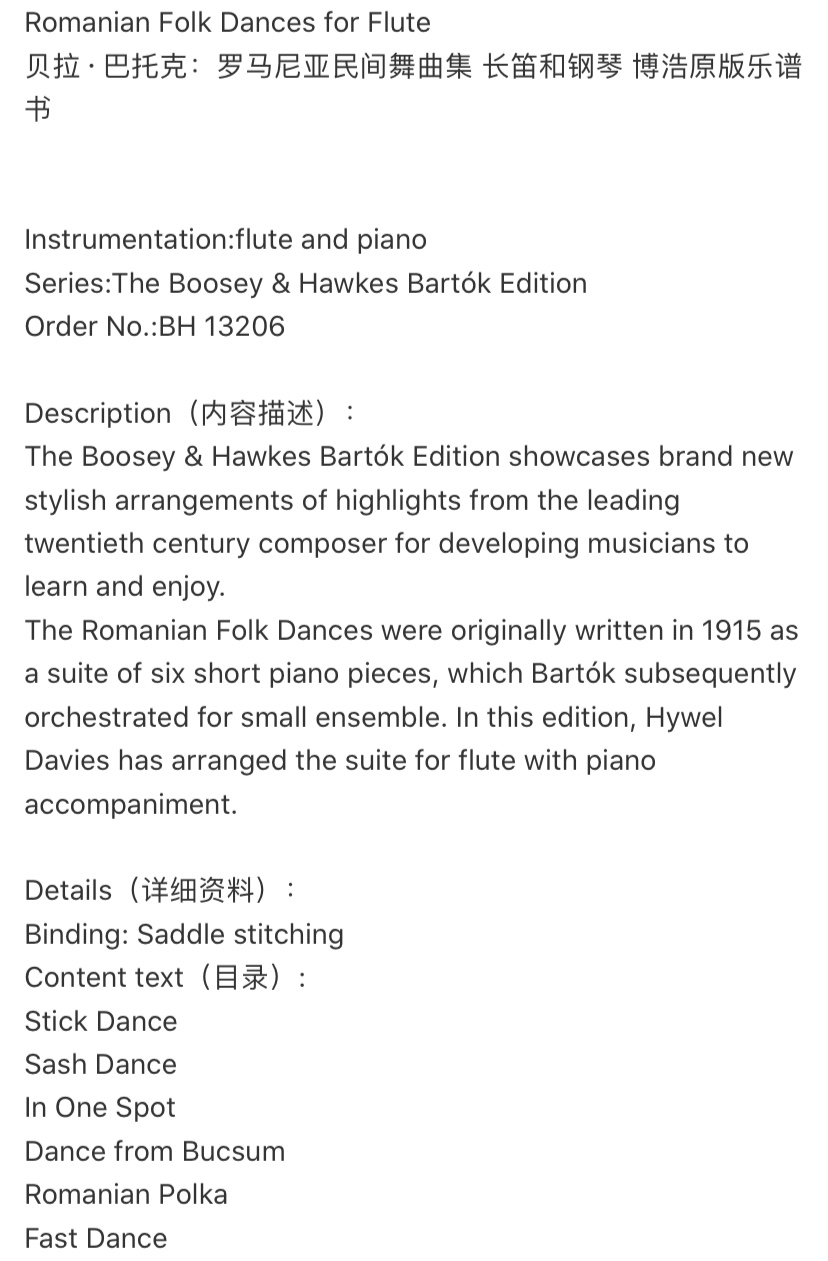 博浩原版 BH13206 Piano Dances 罗马尼亚民间舞曲集 长笛和钢琴 for Bartok 乐谱书 and 巴托克 Romanian Flute Folk