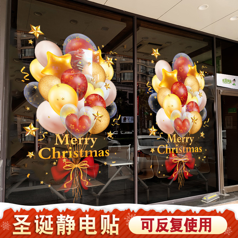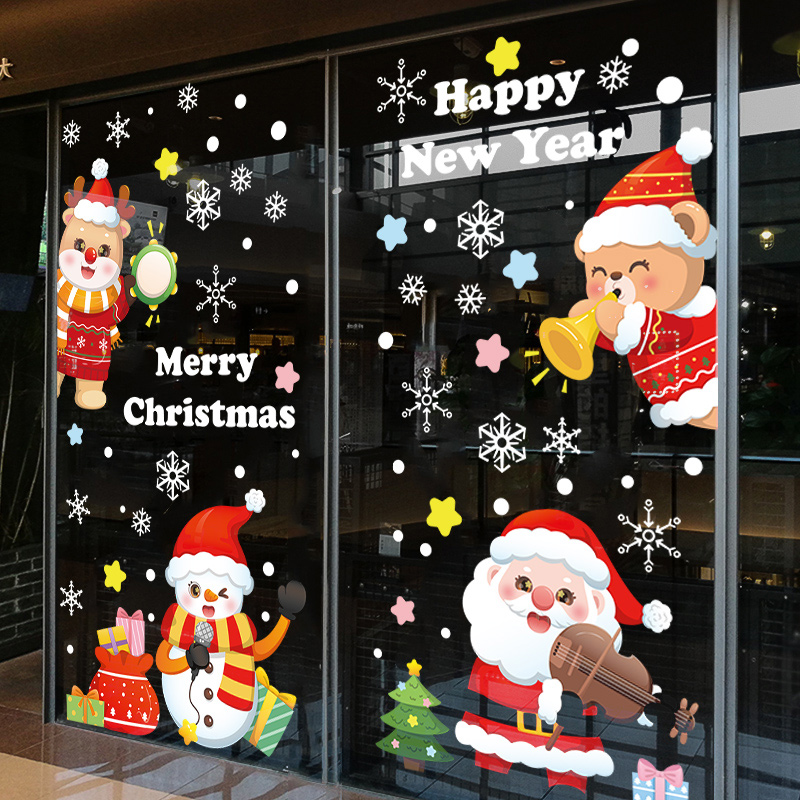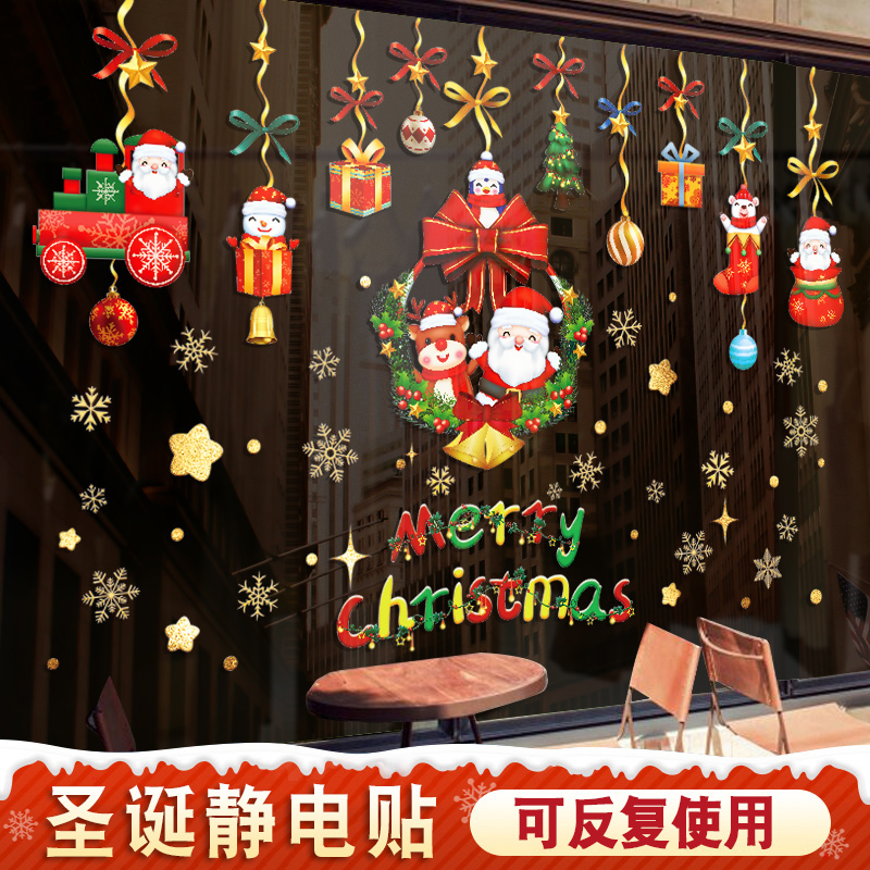 圣诞节装 饰品静电贴玻璃门贴纸复古圣诞老人骑车橱窗贴画场景布置