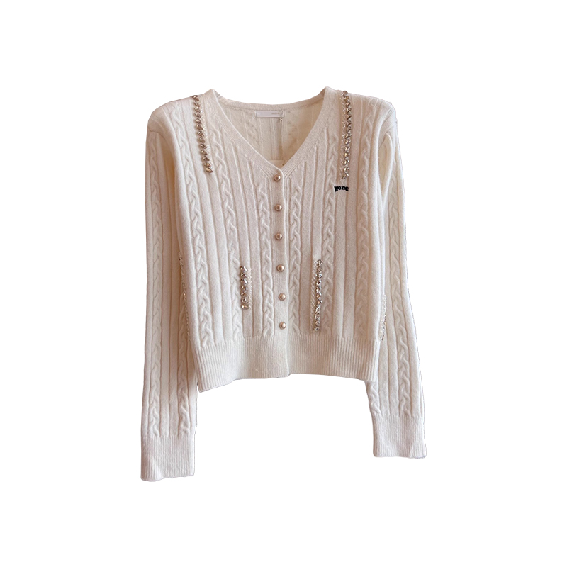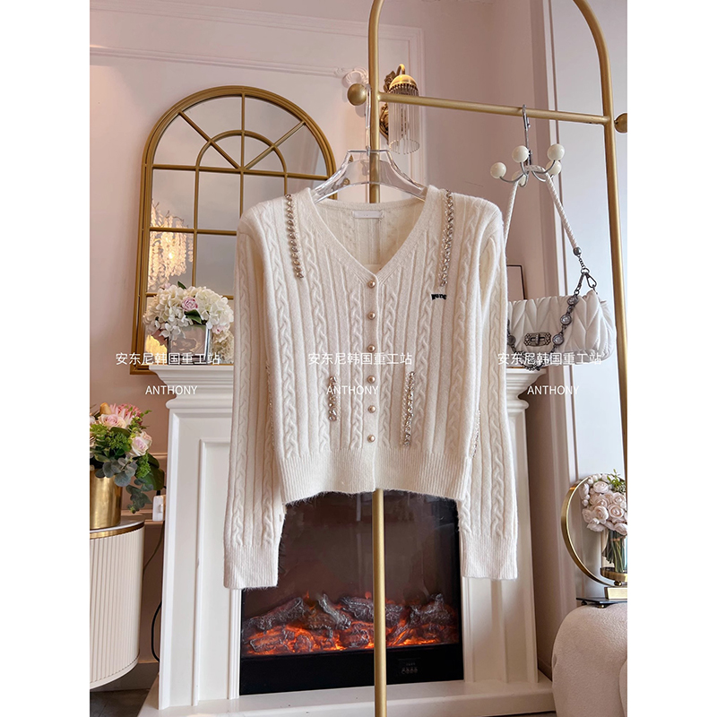 妖精 慵懒风宽松显瘦 口袋亮闪彩点V领咖色毛衣女2025年秋冬新款