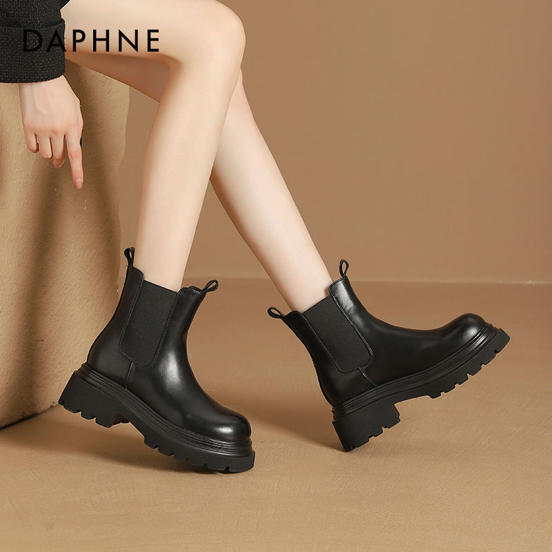达芙妮马丁靴女款 春秋靴子女切尔西靴烟筒靴黑色厚底短靴 2025新款