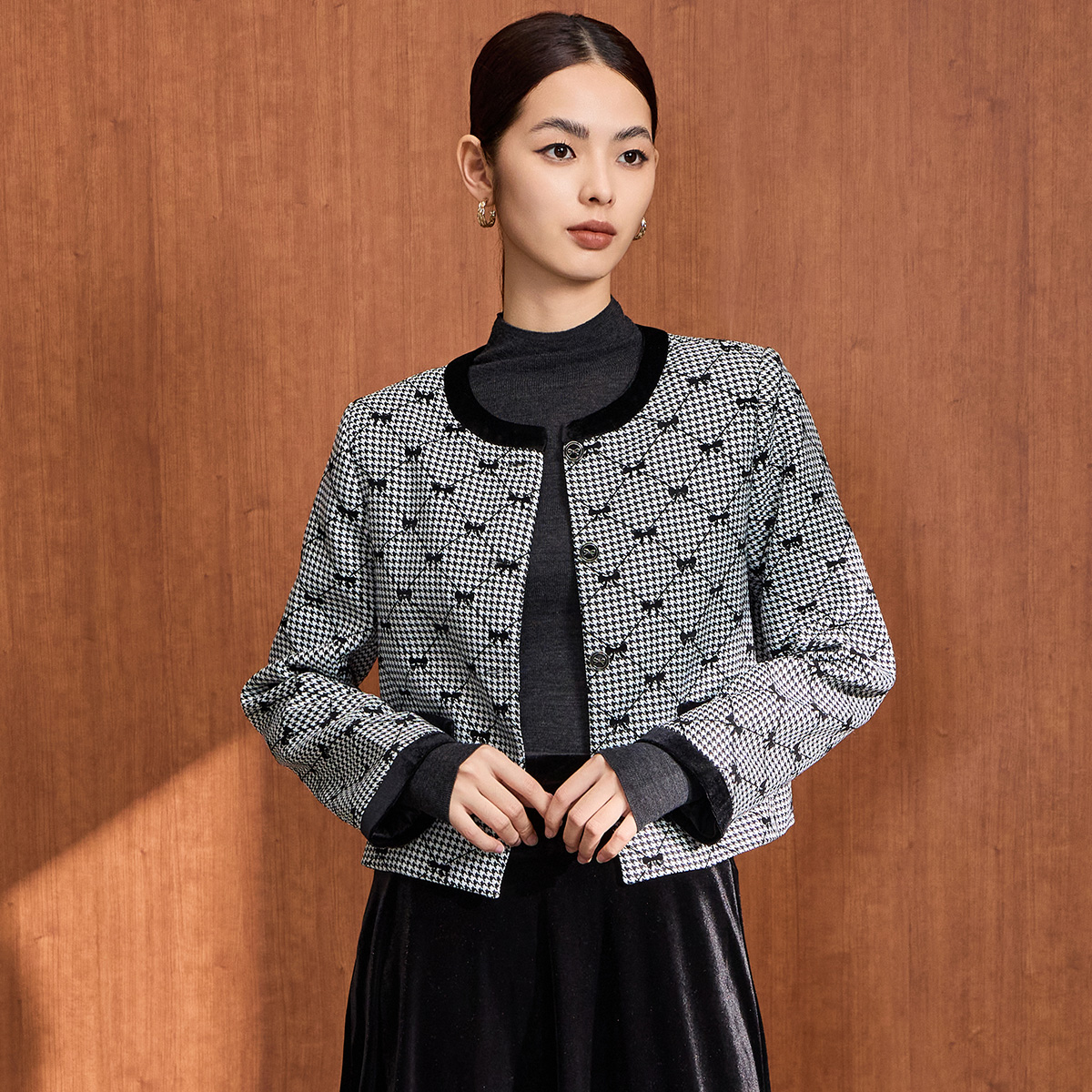 气质圆领高级感外搭时尚 马天奴女装 外套长袖 黑色格纹短款 春秋新款