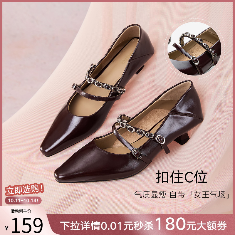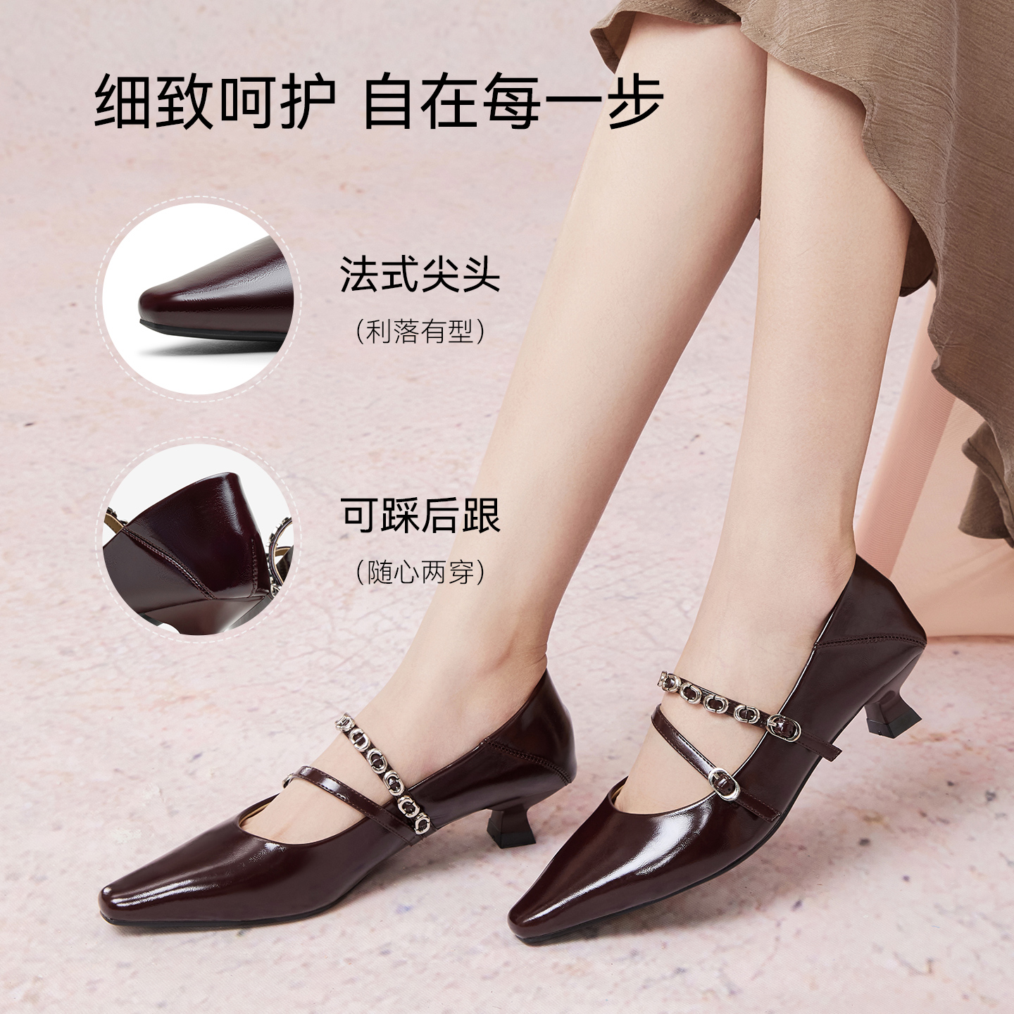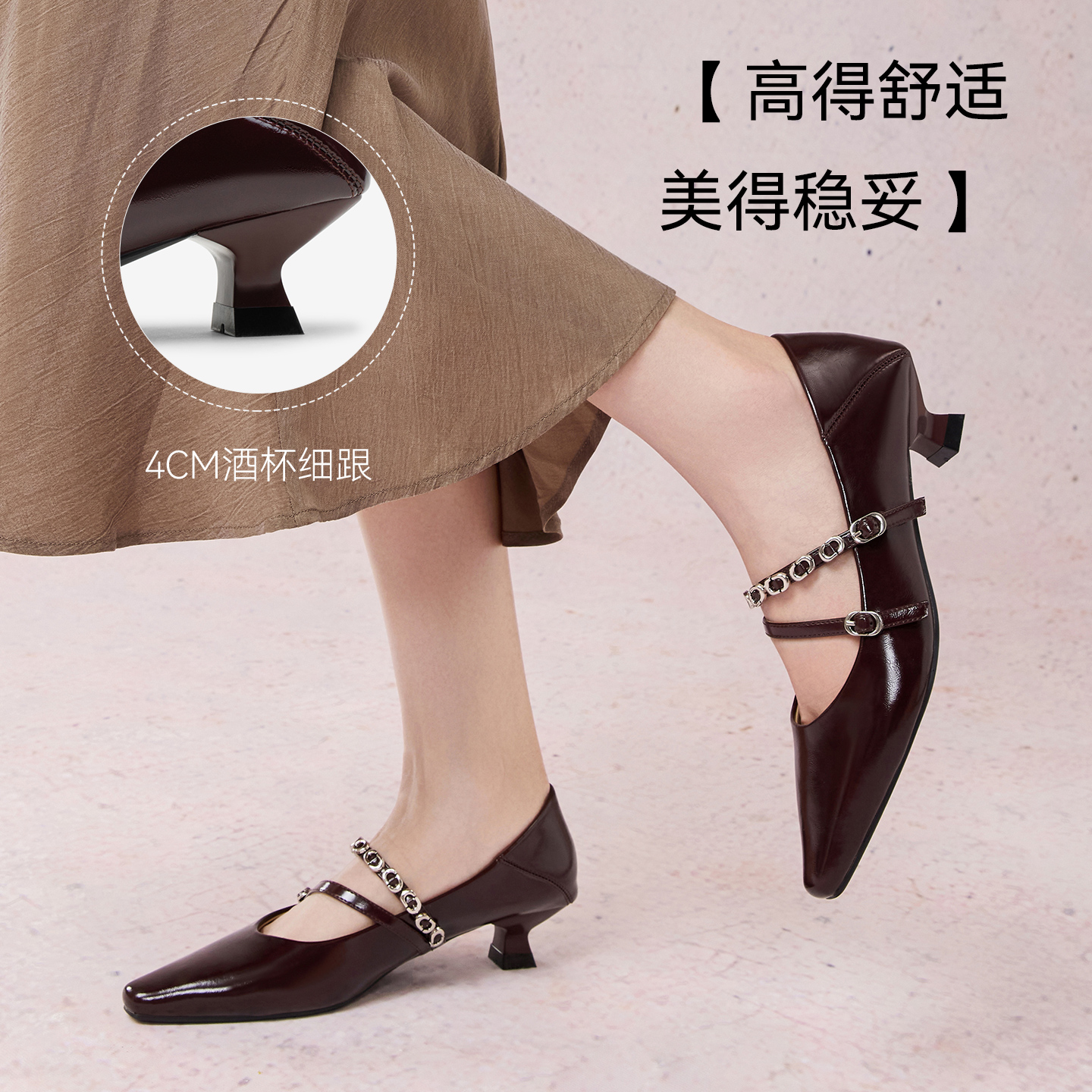 尖头女单鞋 百思图2025秋季 舒适细跟跟鞋 红色玛丽珍鞋 B1299CQ5 新款