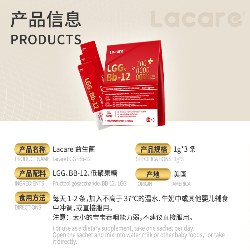Bb12菌株3条体验装 lacare婴幼儿宝宝舒敏益生菌LGG 自营