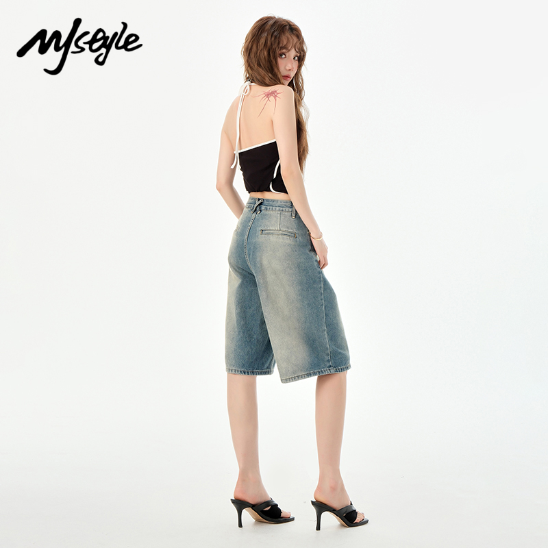 宽松显瘦阔腿七分中裤 女夏2025新款 复古五分牛仔短裤 STYLE美式