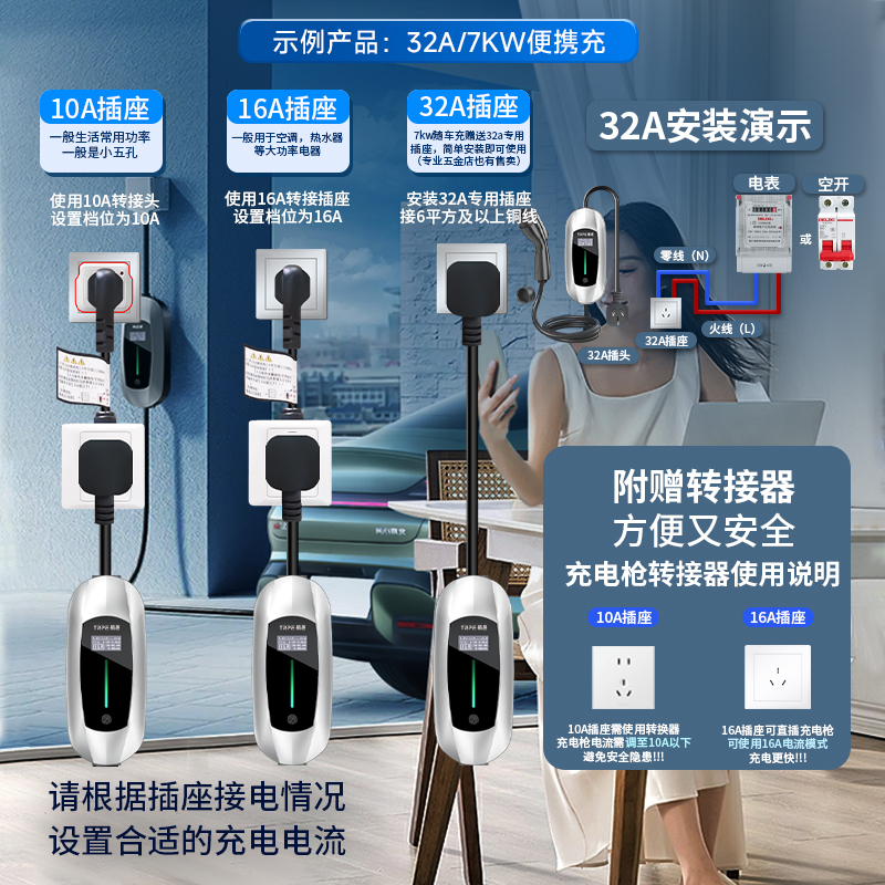 新能源电动汽车16A便携式 随车充7KW比亚迪理想小鹏特斯拉充电桩枪