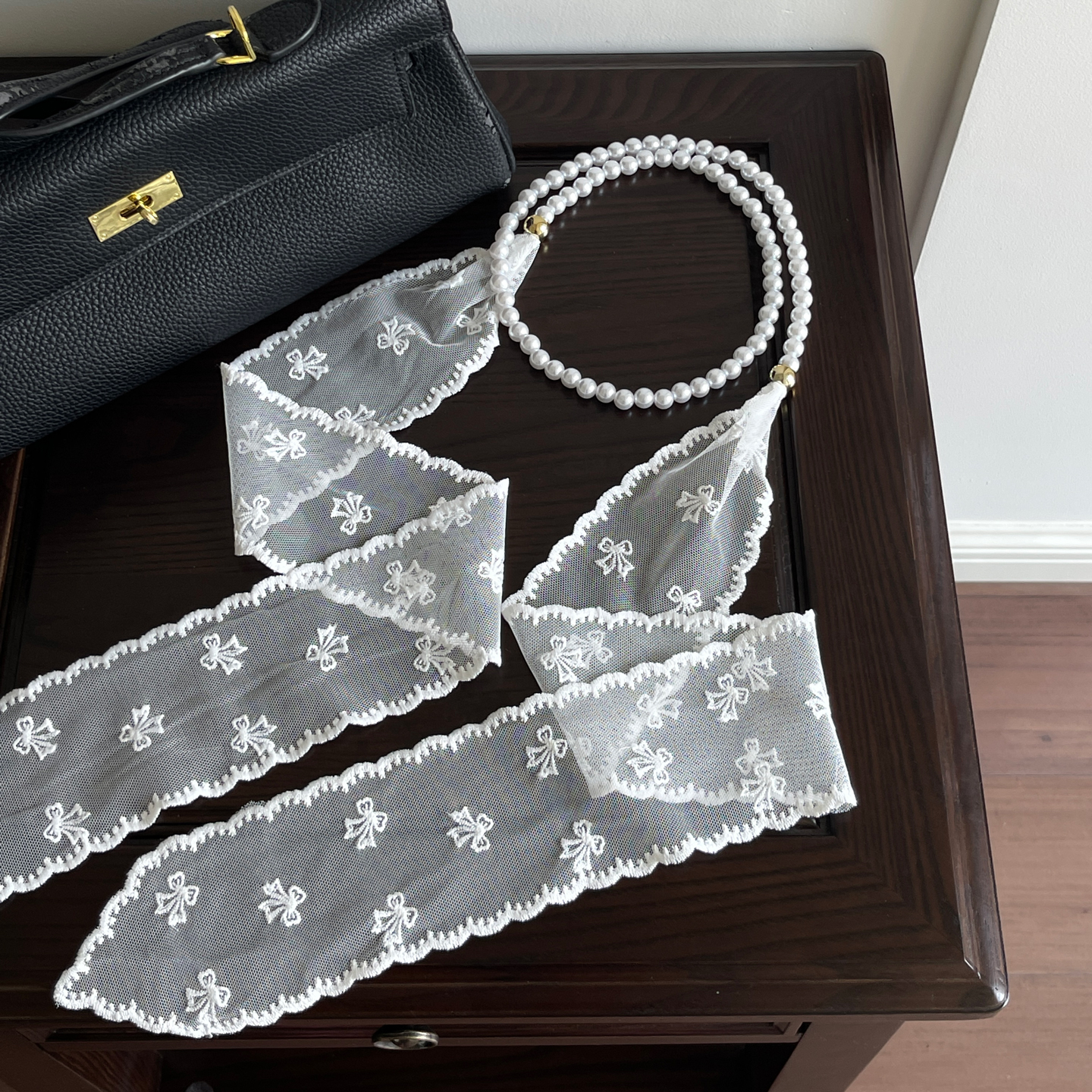 法式 气质甜美多功能飘带丝巾高级感绑发带 超仙珍珠蕾丝腰带女夏季
