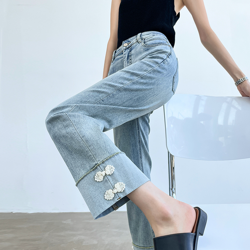 高腰显瘦小个子九分烟管裤 薄款 女夏季 国风盘扣卷边八分直筒牛仔裤