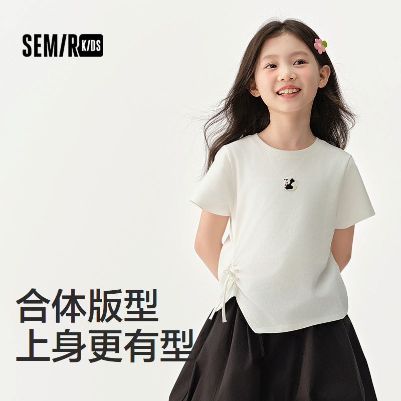 森马儿童短袖 女童可盐可甜熊猫刺绣上衣抽褶蝴蝶结 T恤2025夏新款