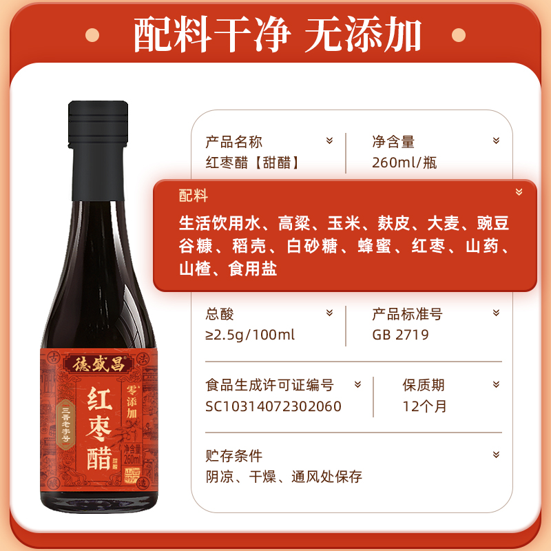 德盛昌红枣醋260ml山西特产陈醋0添加小瓶装 饺子凉拌醋可直饮