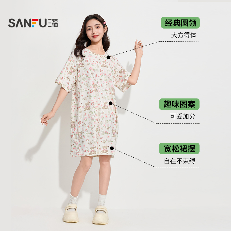 家居服497886 甜美宽松柔软优可丝短袖 三福女夏季 萌趣卡通睡裙