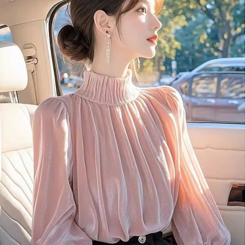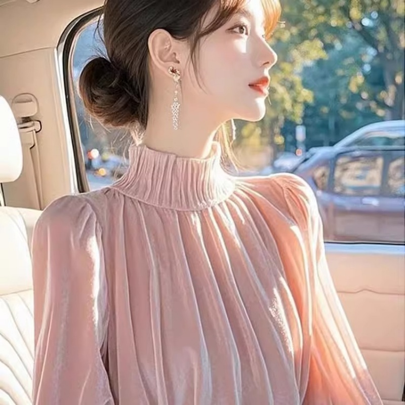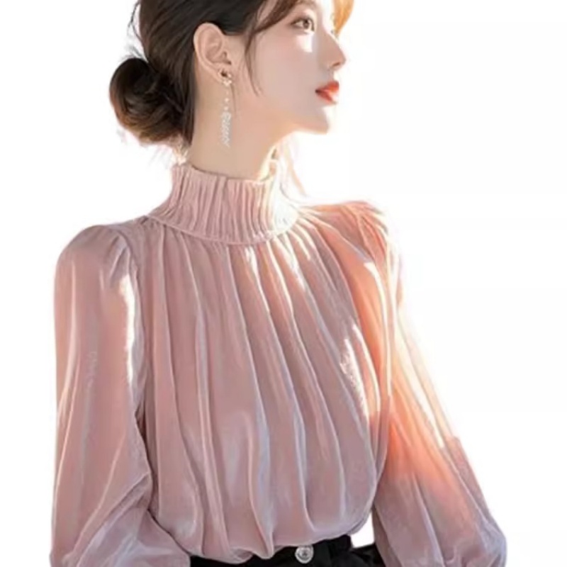 女 显瘦内搭粉色半高领衬衫 专柜撤回2025早春新款 洋气独特别致修身