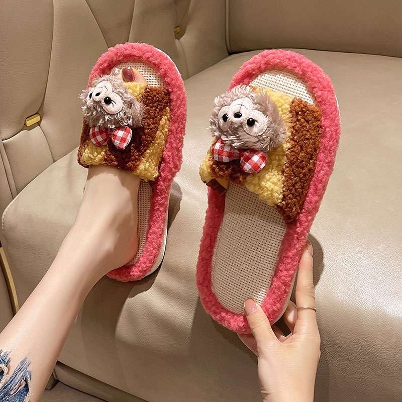 卡通可爱毛绒室内居家软底防滑一字拖 2025新款 亚麻拖鞋 女士春秋季