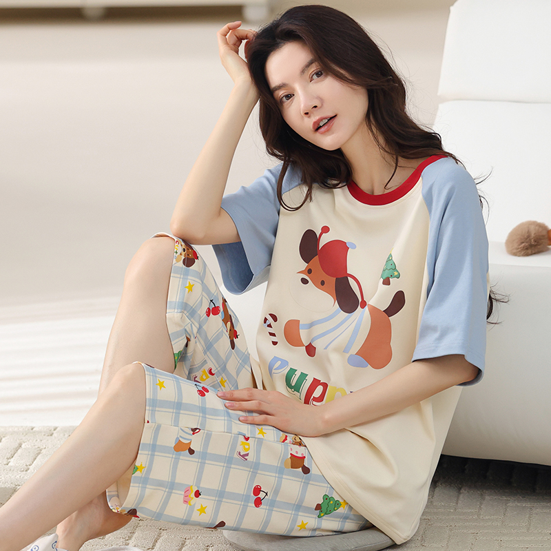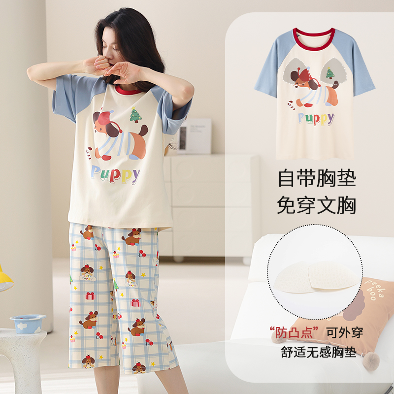 2025年新款 套装 纯棉短袖 带胸垫家居服全棉薄款 七分裤 睡衣女士夏季