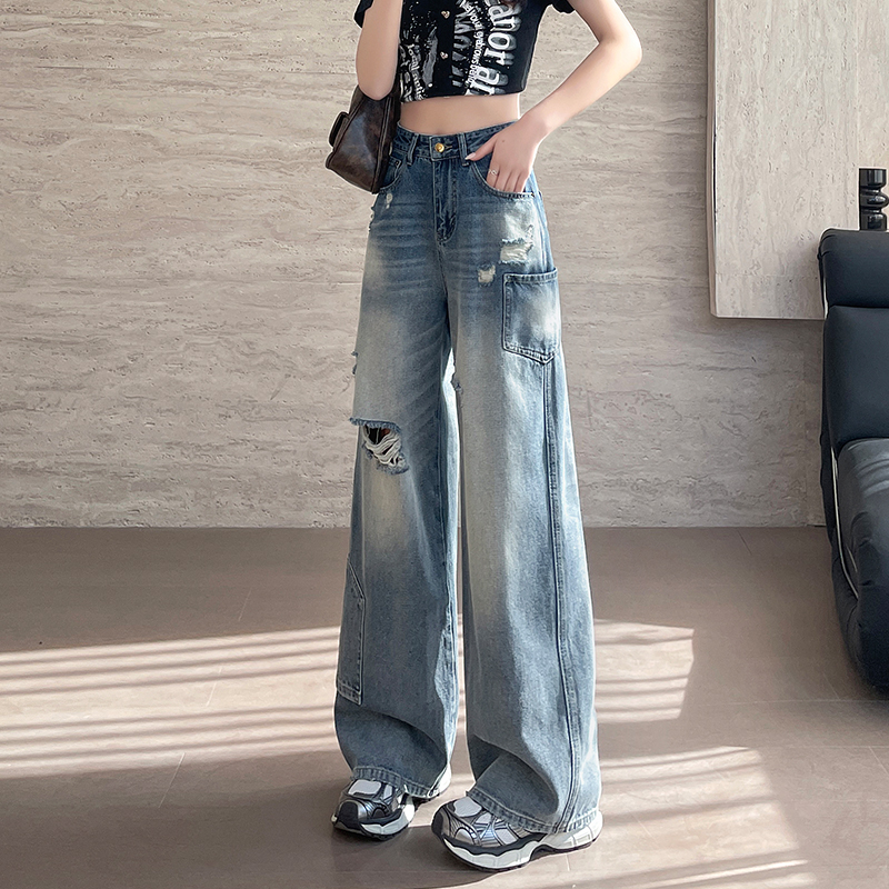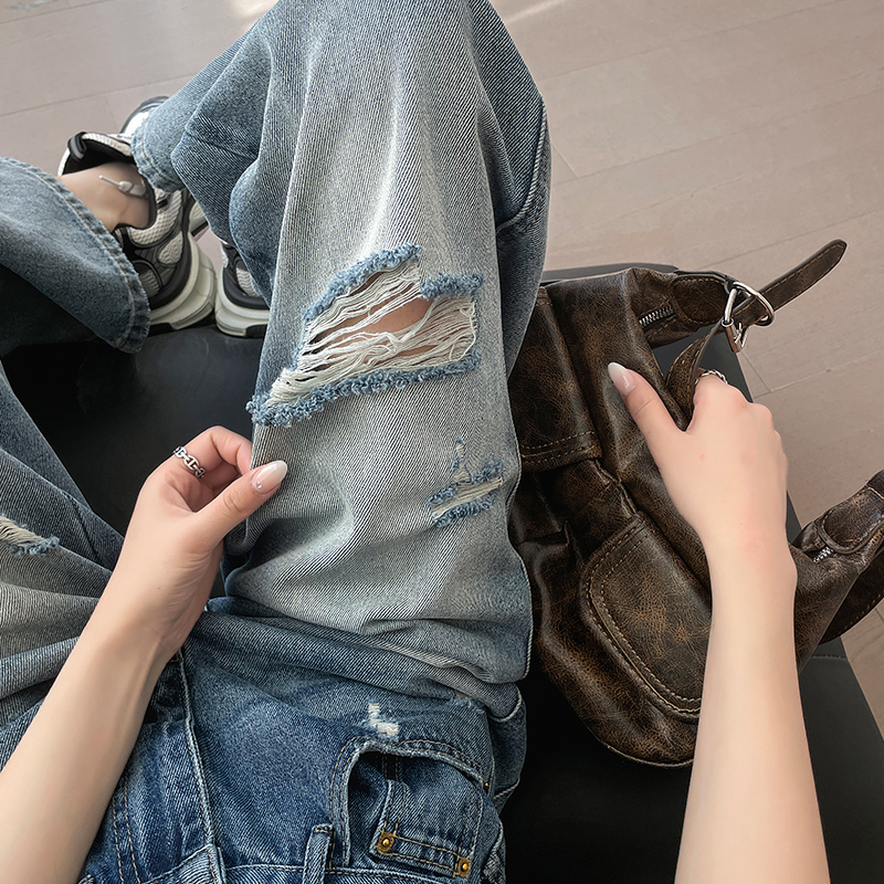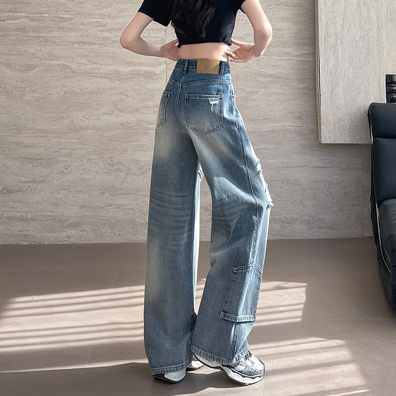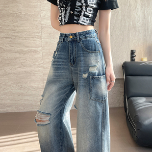 高腰宽松显瘦复古破洞直筒长裤 美式 女春秋2025新款 阔腿牛仔裤 工装